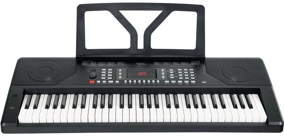 Keyboard – 61 klávesov, s dynamikou, povrch klávesov lesklý, 300 zvukov s výkonom 12 W, automatické sprievody, USB MIDI, výučbový systém, prevádzka na batérie, hmotnosť 4,7 kg, súčasťou balenia je adaptér a notový pult Ak si chcete zaobstarať hudobný nástroj, ktorý je modernou alternatívou tradičného piana, odporúčame vám elektronické klávesy FunKey. Disponujú 61 klávesmi štandardných rozmerov, prepracovaným zvukom