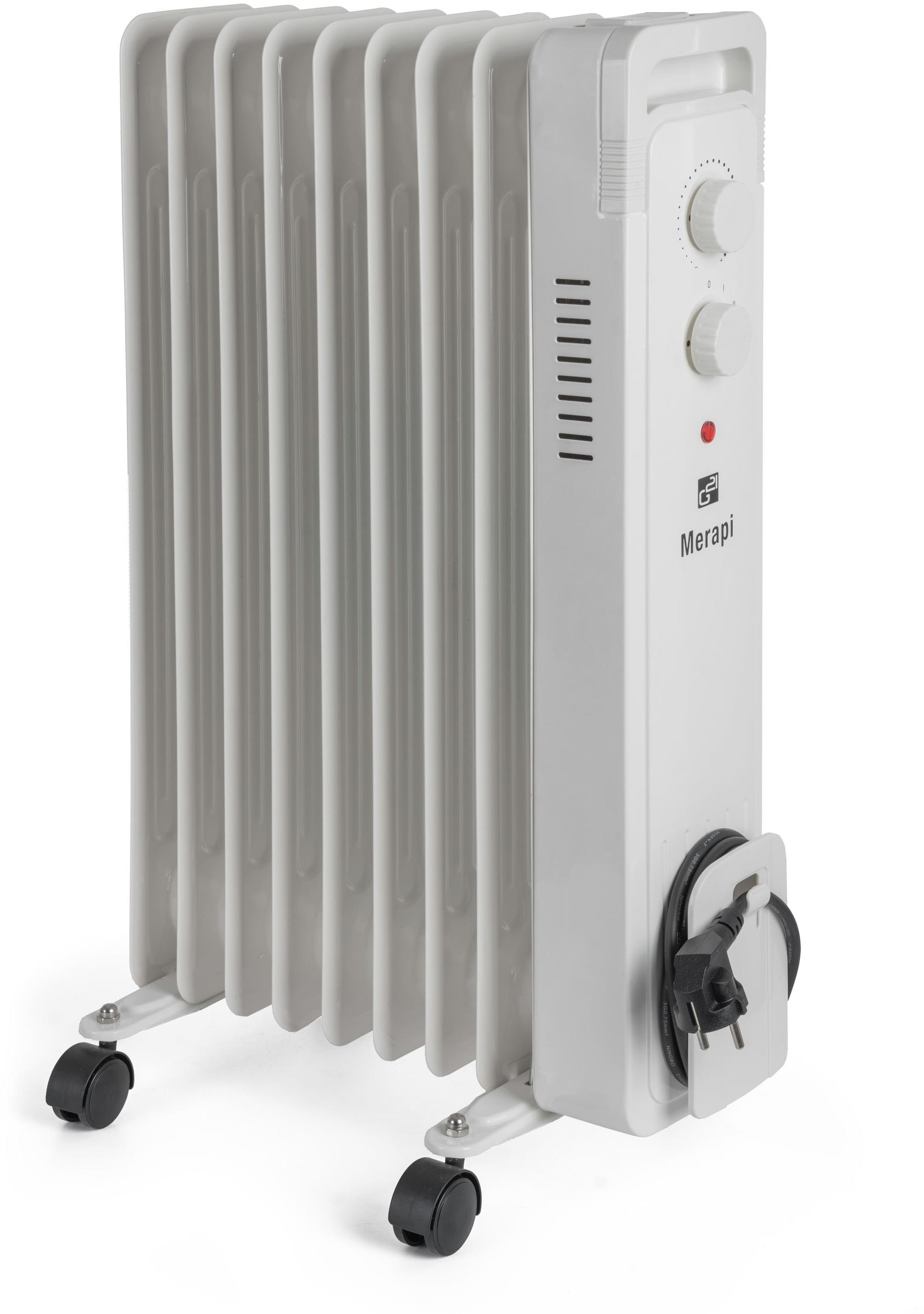Olejový radiátor – rebrový, elektrický, voľne stojací, príkon 2000 W, vykurovací výkon 2 kW, materiál oceľ, biela farba, 3 stupne výkonu, 9 vykurovacích článkov, mechanické ovládanie, spínač naklonenia, termostat súčasťou, s tichým režimom a regulácia výkonu, rozmery 62 × 38 × 24 cm (V׊×H), hmotnosť 8,3 kg Deväťrebrový radiátor G21 Merapi s vysokým výkonom a tichým chodom vyhreje všetky priestory s nedostatočným alebo žiadnym vykurovaním. Využijete ho napríklad na prikurovanie v obytných priestoroch vrá