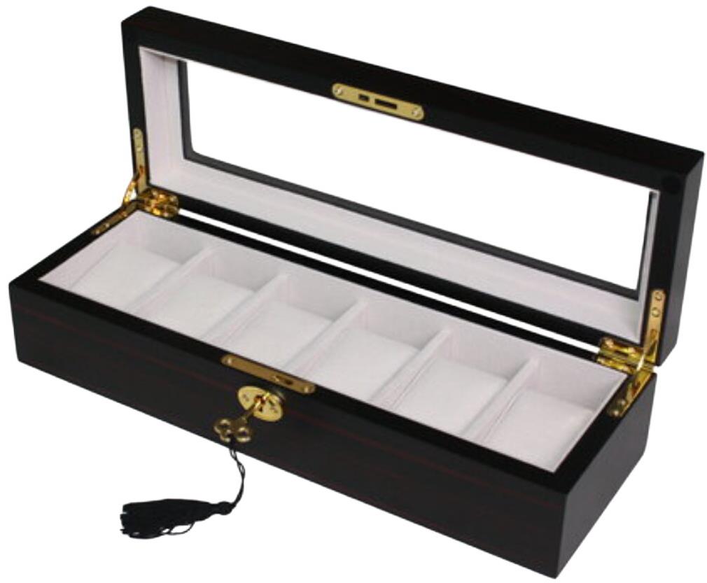 Kazeta na hodinky – 36 × 13 × 9 cm, drevený box, na 6 ks náramkových hodiniek, tmavohnedý, matný lak, vo vnútri je zamat, presklené veko so zámkom Kazeta Gaira umožní štýlové uloženie hodiniek alebo…