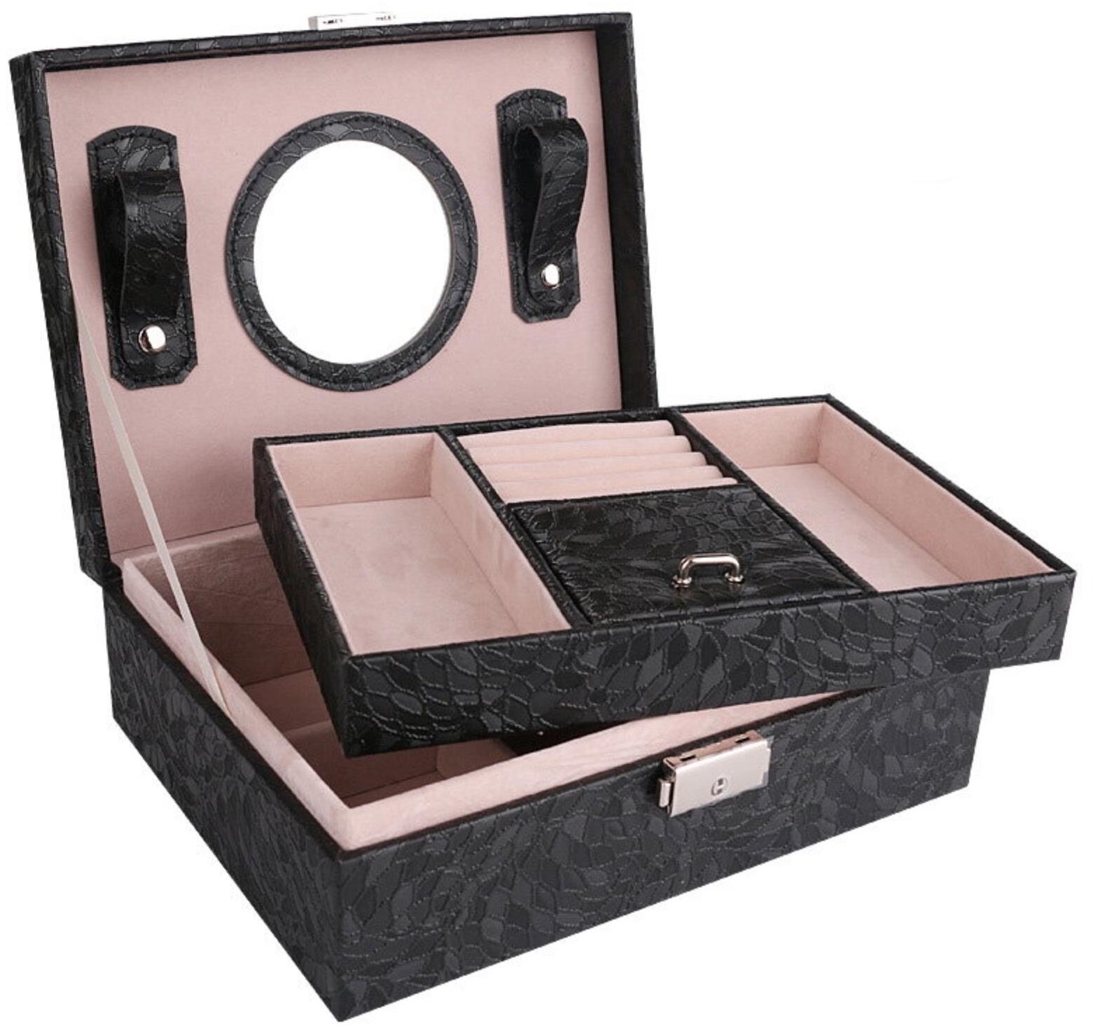 Šperkovnica – zo syntetickej kože, kufrík, so zrkadlom, s vekom, uzamykateľná, 2 poschodia, rozmery 8,5 × 23 × 17 cm (V׊×H), čierna farba Šperkovnica Gaira® je perfektná voľba na ochranu vašich klenotov. Vďaka spracovaniu zo syntetickej kože ponúka sofistikovaný vzhľad a jednoduchú údržbu. Šperkovnica vo forme kufríka sa vám bude hodiť,