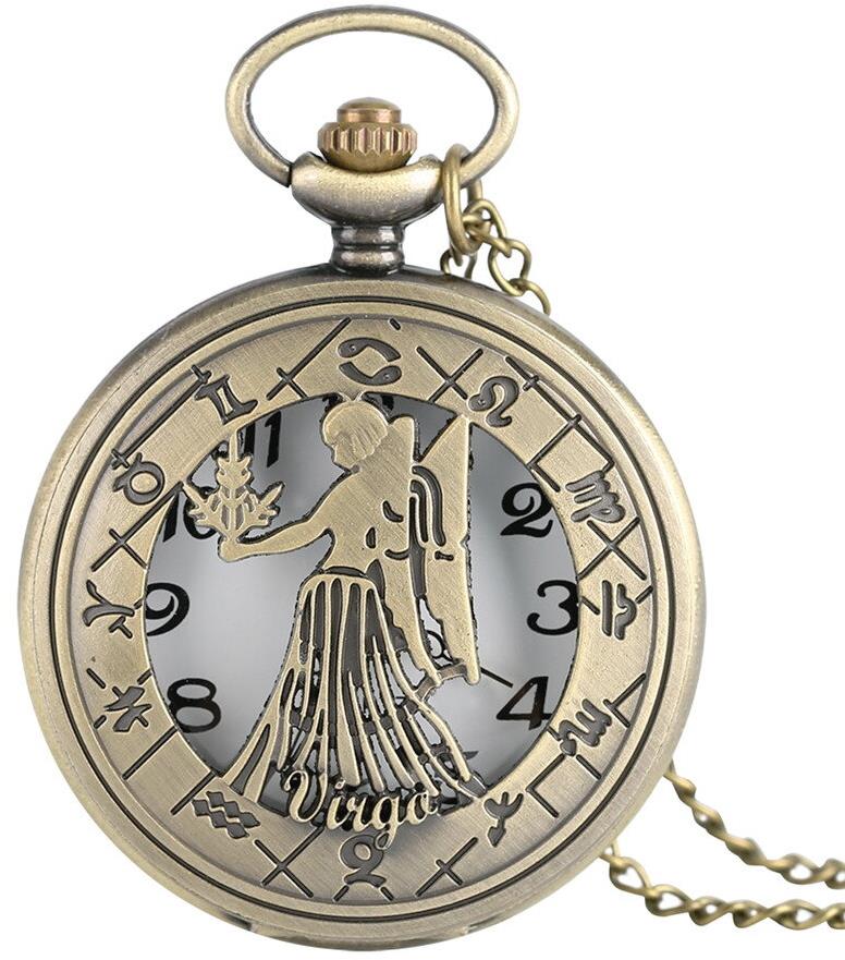 Vreckové hodinky – symboly horoskopu sú vyobrazené na otváracom viečku hodiniek, obal hodiniek je vyrobený z bižutérneho kovu bronzovej farby, priemer puzdra je 48 mm, pohon strojčeka je batériový Vreckové hodinky Gaira 308475 predstavujú štýlový doplnok pre mužov. Sú zdobené symbolmi znamenia zverokruhu panna, ktoré sú vyobrazené na otváracom viečku. Puzdro hodiniek je vyrobené z kvalitného bi