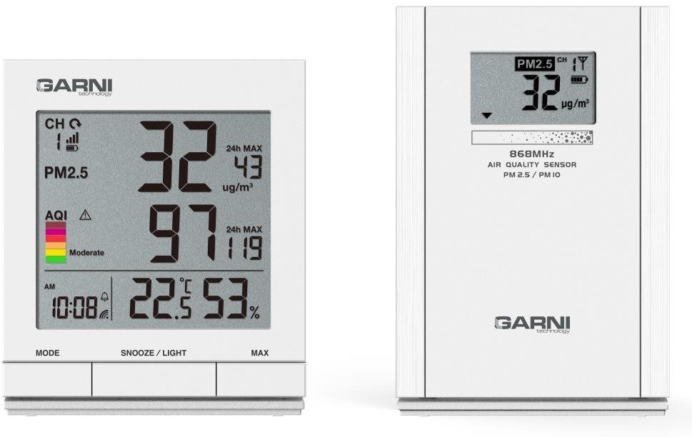 Merač kvality vzduchu – detekcia teploty, vlhkosti, prachových častíc, meranie teploty od -40 do 70 °C, meranie vlhkosti od 1 do 99 %, sieťové + batériové napájanie, dosah 100 m, akustická, optická signalizácia, indikácia stavu batérie a displej, funkcia hodiny a budík, napájací adaptér a batéria v balení, samostatne funkčná jednotka Merač kvality vzduchu GARNI 204 OneCare je stvorený na vnútorné použitie. Meria hodnoty kvality vzduchu, a to koncentráciu pevných častíc PM2.5 a PM10 pomocou bezdrôtového čidla GARNI 104Q, ako aj tep
