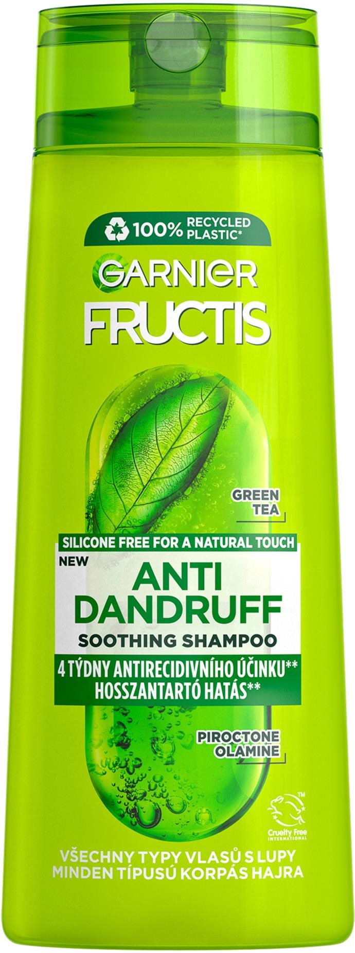 Šampón – tekutý, na všetky typy vlasov, objem 250 ml Šampón GARNIER Fructis Antidandruff vďaka svojmu zloženiu harmonizuje produkciu mazu, má fungicídne aj antimikrobiálne účinky a intenzívne hydratuje pokožku hlavy. Spoľahlivo eliminuje lupiny a zamedz