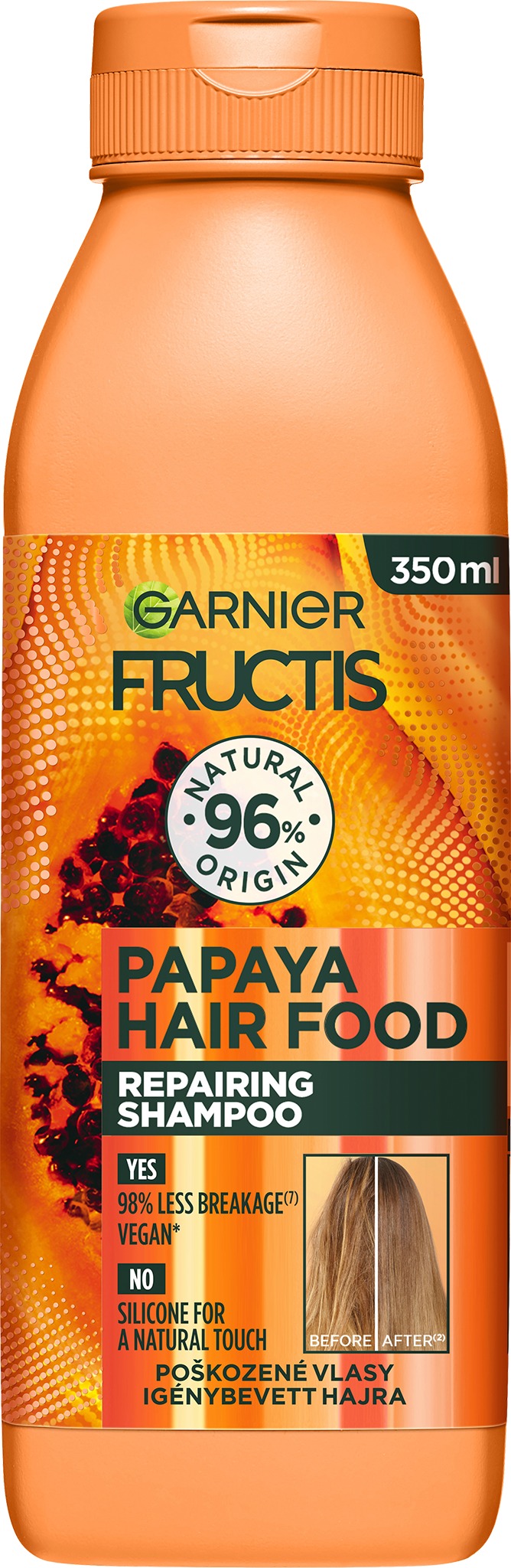 Šampón pre ženy – tekutý, na poškodené vlasy, zloženie s prírodnými zložkami, objem 350 ml Stavte na silu prírody a vyskúšajte šampón Garnier Fructis Hair Food Repairing Papaya. Jeho zloženie je z 98 % prírodného pôvodu a neobsahuje žiadne silikóny. Jemná pena šetrne, ale veľmi efektívne um
