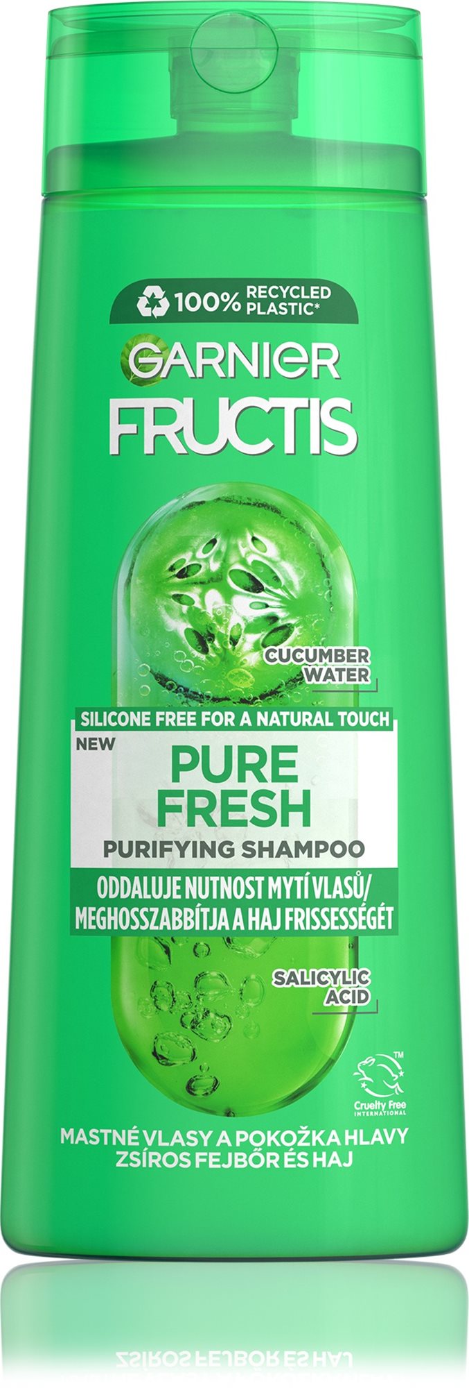 Šampón pre ženy – tekutý, na mastné vlasy, zloženie bez parabénu, objem 250 ml Šampón Garnier Fructis Pure Fresh je ideálnou voľbou na rýchlo sa mastiace vlasy. Jemne čistí pokožku hlavy aj vlasy vďaka svojmu zloženiu obohatenému o uhorkový extrakt, ktorý prináša pocit sviežosti