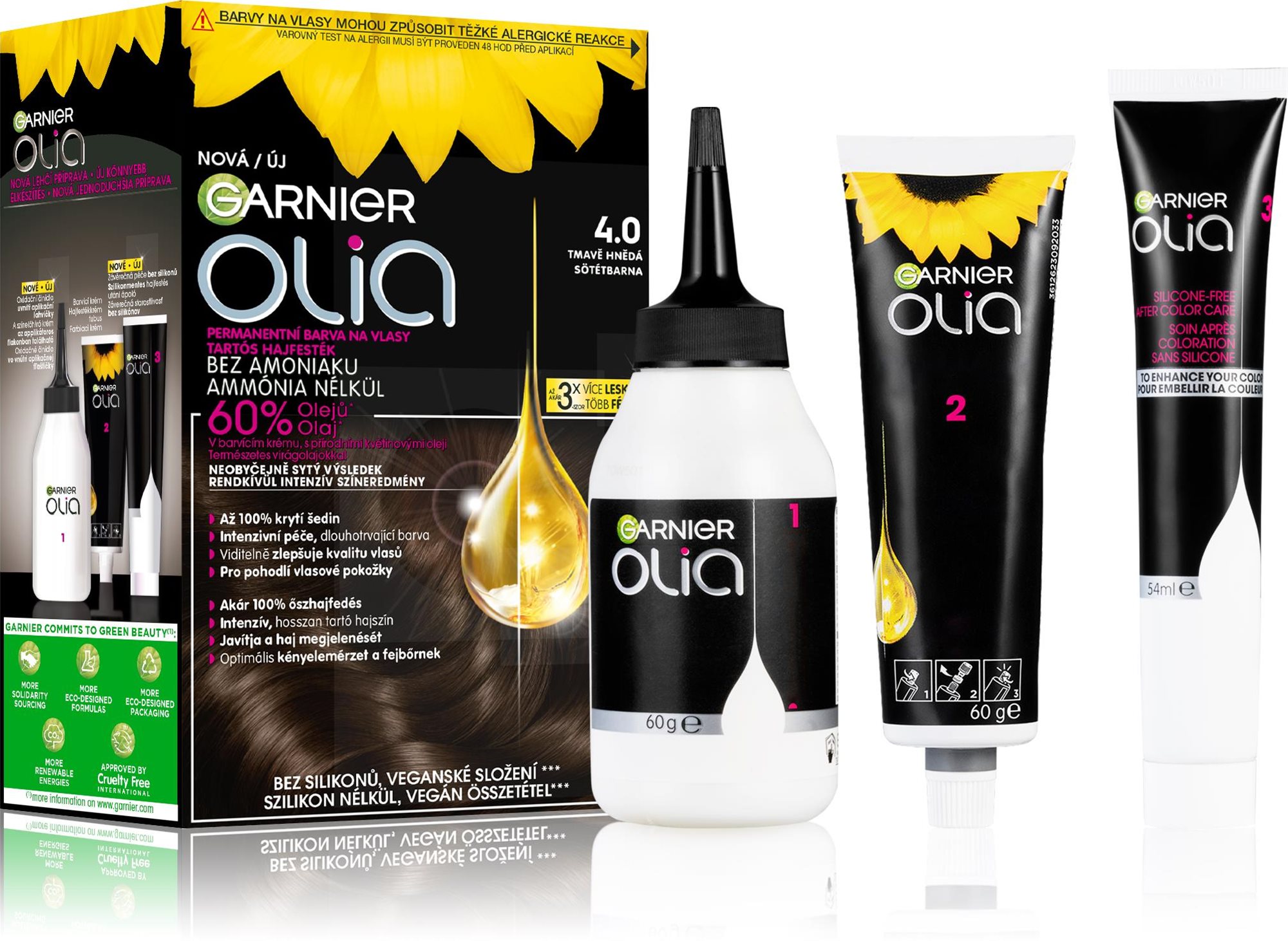 Farba na vlasy – hnedá, permanentná, vyhotovenie: dekoratívne, bez amoniaku, bez parabénov, bez silikónu a bez SLES, komplexné zafarbenie, na všetky typy vlasov, odhadovaná výdrž až 8 týždňov, aplikátor a návod v balení, objem 174 ml Máte v úmysle si farbiť vlasy v pohodlí domova a páči sa vám hnedá farba? Potom vás zaiste poteší farba na vlasy GARNIER s objemom 174 ml. Hovoríme o permanentnom druhu farby GARNIER Olia 4.0 Tmavo hn