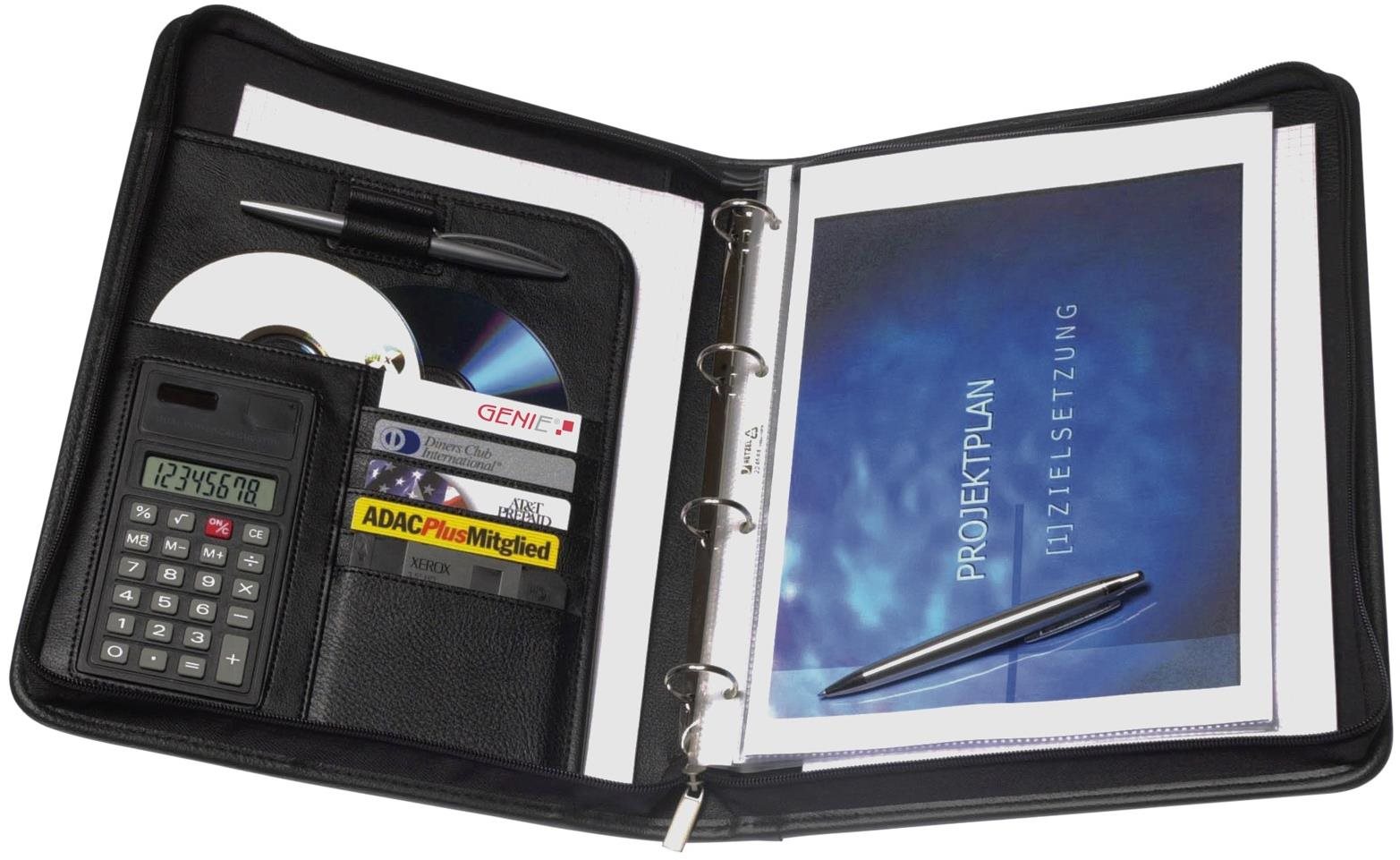 Dosky na dokumenty A4 – kožené, konferenčné, krúžkový mechanizmus vo vnútri, s gumovými pútkami, 5 priehradiek, kalkulačka súčasťou, na zips, čierna farba, rozmery 35,8 × 28 cm (V׊), šírka chrbta 4,8 cm Chcete si pohodlne uschovať najrôznejšie dokumenty a ďalšie príslušenstvo na jednom mieste a vziať si všetko potrebné kamkoľvek so sebou? Genie Exklusiv sú konferenčné dosky z odolného materiálu imitu