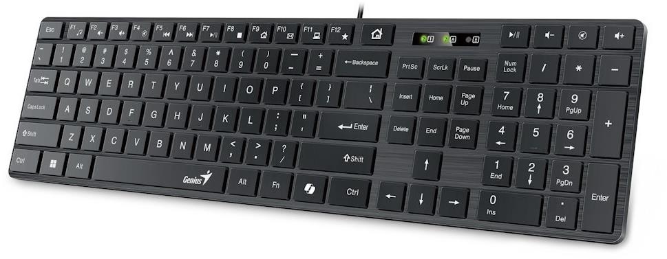Klávesnica – drôtová, česká a slovenská lokalizácia, membránový spínač, formát klávesnice 100 %, čierna, 43,14 × 2,24 × 11,74 cm (Š×V×H) Ak píšete dlhšie texty, budete potrebovať klávesnicu bežnej veľkosti. Viac miesta spoločne s lepšou odozvou sú nespochybniteľné plus. Ako prvé budete hľadať správny model podľa určenia. Genius Slimsta