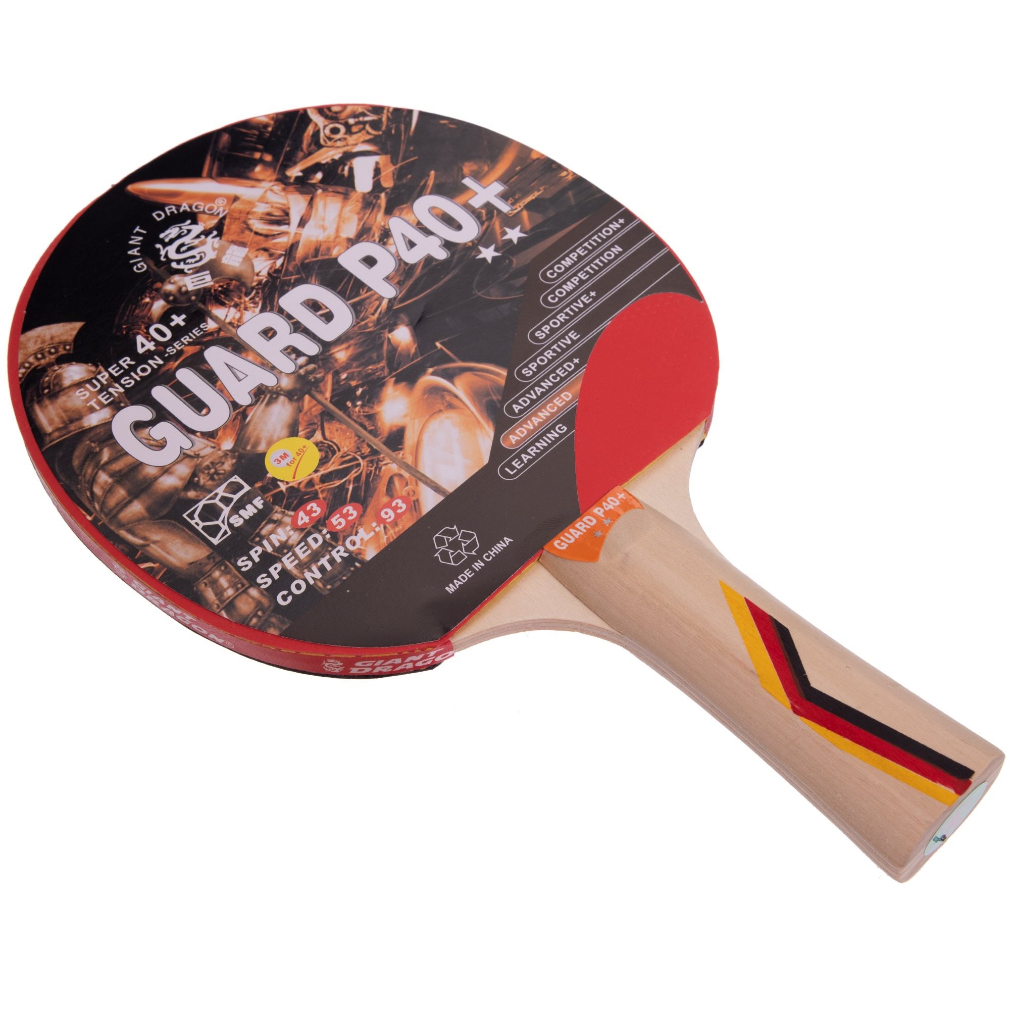 Pingpongová raketa – dvojhviezdičková, konkávne (FL) držadlo, hmotnosť 150 g Obzeráte sa po ping-pongovej pálke a neviete, ktorú vybrať? Máme tu v ponuke pálku na stolný tenis Giant Dragon GUARD P40+. Táto dvojhviezdičková raketa je pripravená na amatérske hranie. Umož