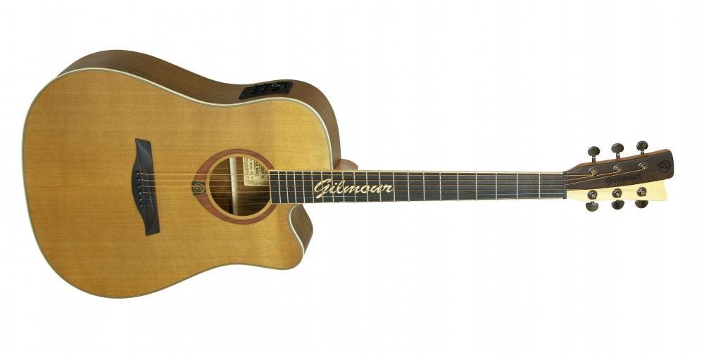 Elektroakustická gitara – 6 strún, telo Dreadnought, 20 pražcov, šírka nultého pražca 42,9 mm, polomasívny korpus, matná povrchová úprava, predná doska céder, zadná doska orech, luby orech, krk mahagón, hmatník palisander, so snímačom a zabudovanou ladičkou, balenie obsahuje ladičku Hráte, alebo ešte len chcete začať a hľadáte najvhodnejší nástroj? Elektroakustická gitara Gilmour by mohla byť tá pravá voľba. Je vybavená nultým podvalom v šírke 42,9 mm. Elektroakustická gitara Gil