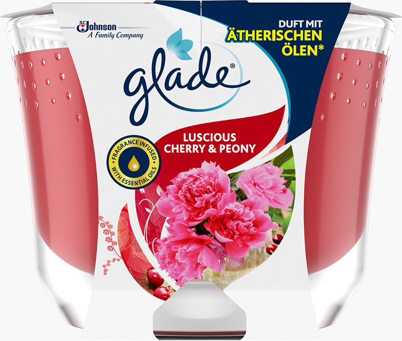 Sviečka – vonná, každodenná, kvetinová vôňa, sklenená nádoba, doba horenia 52 h Parfumovaná vonná sviečka Glade Luscious Cherry & Peony so sladkou vôňou čerešní a pivoniek navodí zvodnú atmosféru v každom interiéri. Príjemná vôňa navodí útulnú atmosféru a pomôže vám sa po cel