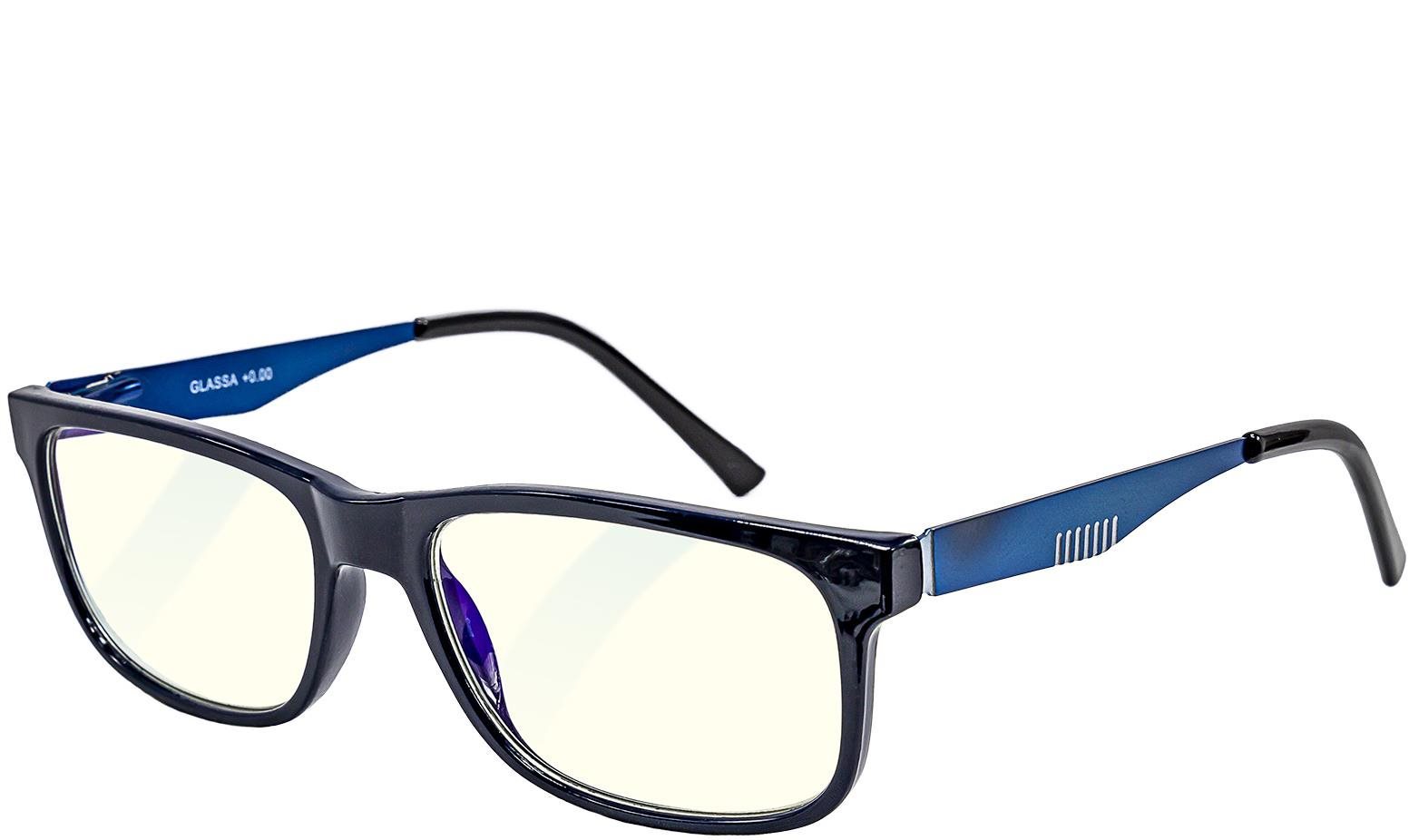 Okuliare na počítač – unisex, na počítač, ochrana proti modrému svetlu 95 %, obdĺžnikové, materiál rámu: plastový, číra farba skiel, čierna a modrá farba rámu, UV ochrana UV400, v balení handrička na čistenie, šírka okuliarov 13,8 cm Okuliare na počítač GLASSA ponúkajú 95 % ochranu proti modrému svetlu a tým znižujú námahu očí a predchádzajú poškodeniu zraku pri dlhodobom používaní displejov. Dioptrické okuliare na PC na blízko s