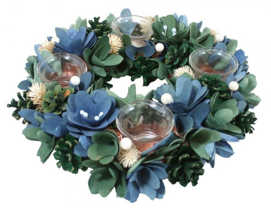 Veniec na stôl – adventný, ozdobený, vonkajší priemer 32 cm, modrá a zelená farba
