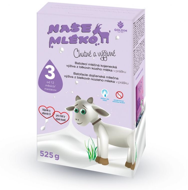Dojčenské mlieko – batoľacie, s kozím mliekom a bez palmového oleja, vhodné od 12 mesiace, veková kategória 3, hmotnosť 525 g Dojčenské mlieko GOLDIM Naše Mléko 3, 525 gPrémiové batoľacie kozie mlieko NAŠE MLÉKO® 3 predstavuje novú generáciu batoľacích mliek nadštandardnej kvality so zdravým kozím mliekom. NAŠE MLÉKO® 3 obsa