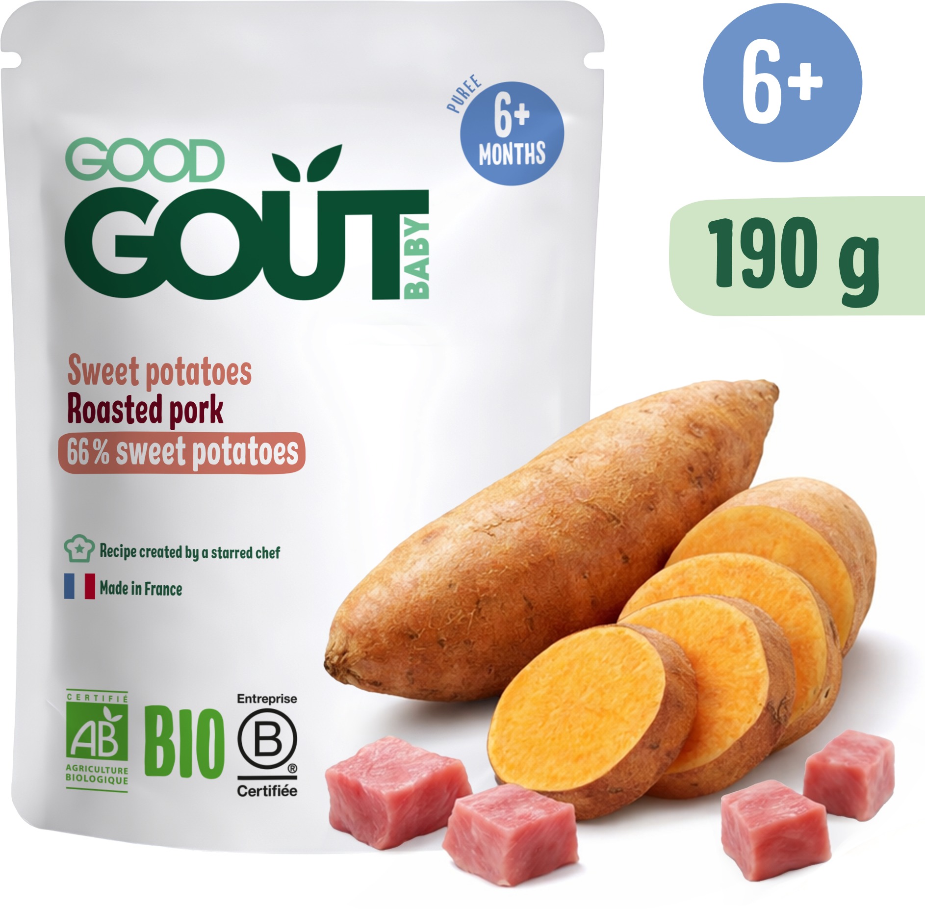Príkrm – mäsovo-zeleninový, pre deti od 6 mesiace, bez lepku, bio kvalita, 1 ks v balení Príkrm Good Gout BIO bataty s bravčovým mäsom 190 gGood Gout BIO Bataty s bravčovým mäsom je mäsovo-zeleninový príkrm pre deti od ukončeného 6. mesiaca. Kombinácia bio batatov, bravčového mäsa z voľné