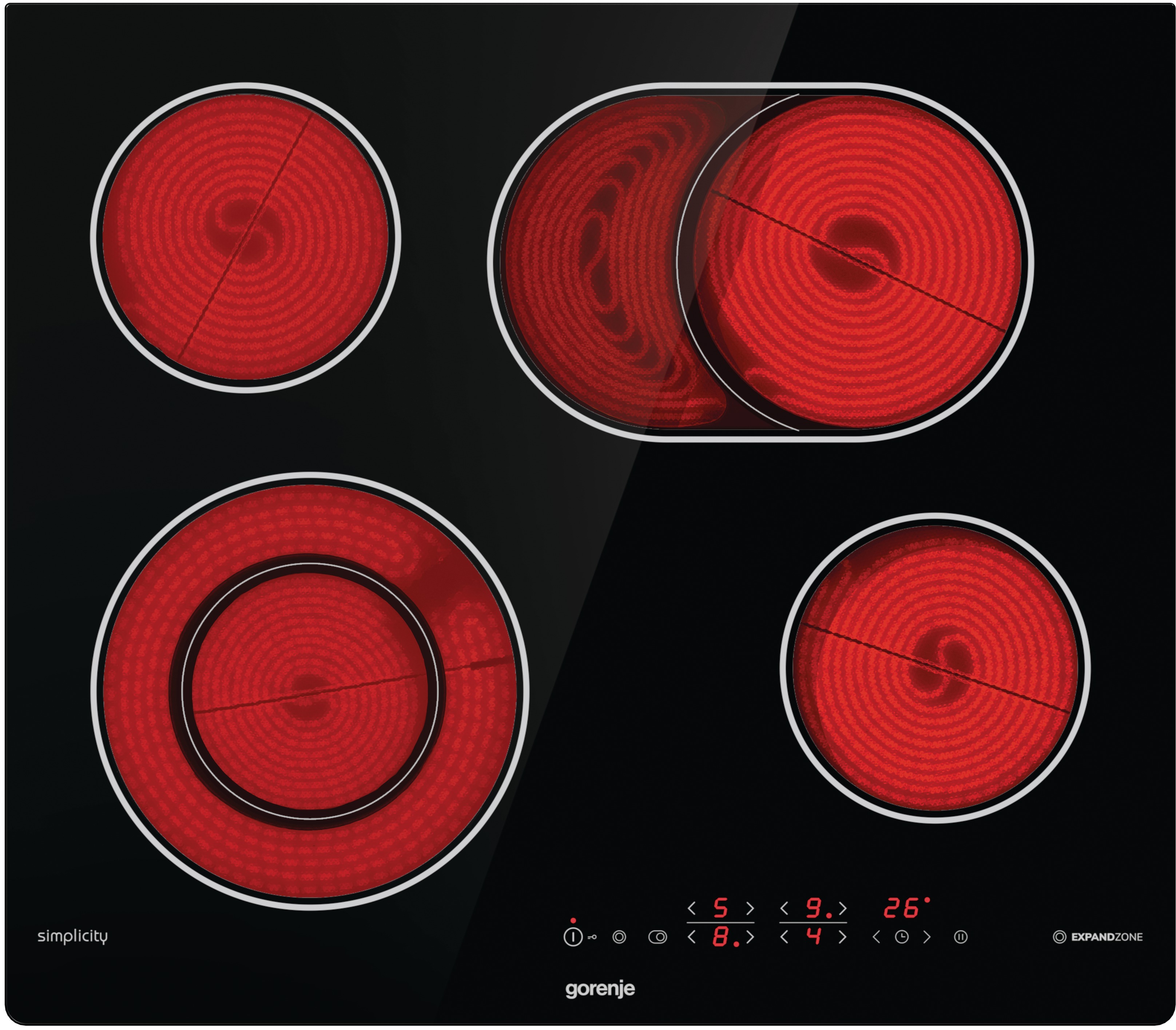 Varná doska – sklokeramická, 4 platničky, detská poistka, udržiavanie teploty a prerušenie varenia, časovač, dotykové ovládanie, skosené hrany, bez rámika, vzhľad čierne sklo, povrch sklo, pripojenie 230 V a 400 V, rozmery 60 × 52…