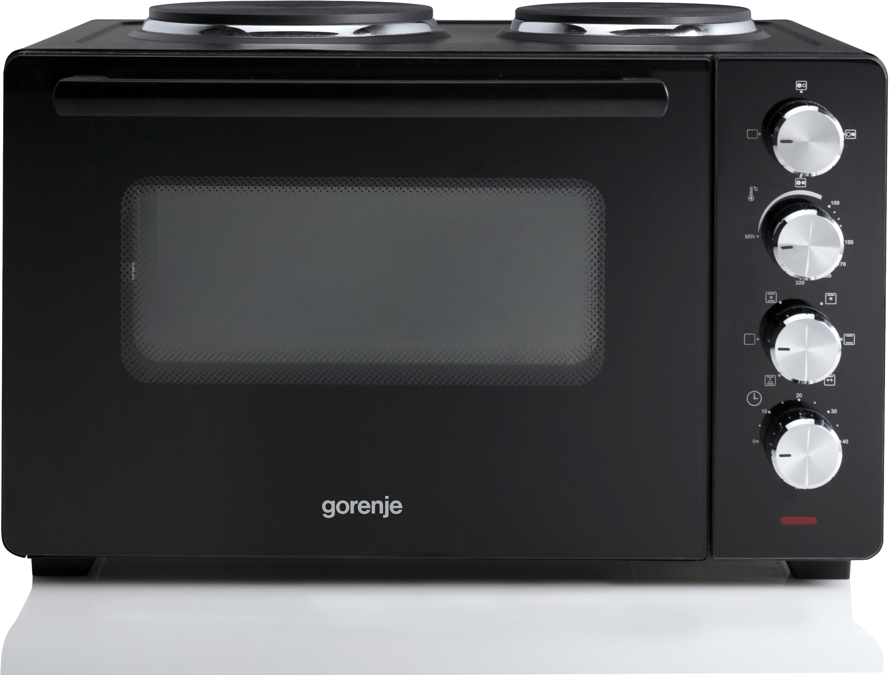 Mini rúra – teplovzdušná a elektrická, príkon 3200 W, objem 30 l, nastaviteľná teplota od 100 do 230 °C, 3D pečenie, horný ohrev, pravý horúci vzduch a spodný ohrev, liatinová varná doska, 2 platničky, termostat, časovač, svetelná kontrolka, protišmykové nožičky a ventilátor, grilovacia mriežka, grilovací ražeň, kliešte, plech a tácka na omrvinky v balení, čierna farba, rozmery 32,1 × 52 × 40,5 cm (V׊×H) Select brand: Mini rúra Gorenje OM30GBXKompaktná a výkonná mini rúraMožnosť viacúrovňového pečeniaRúra súčasne pojme tri drôtené police či plechy na pečenie (36 × 32 cm) Rovnomerná cirkulácia horúceho