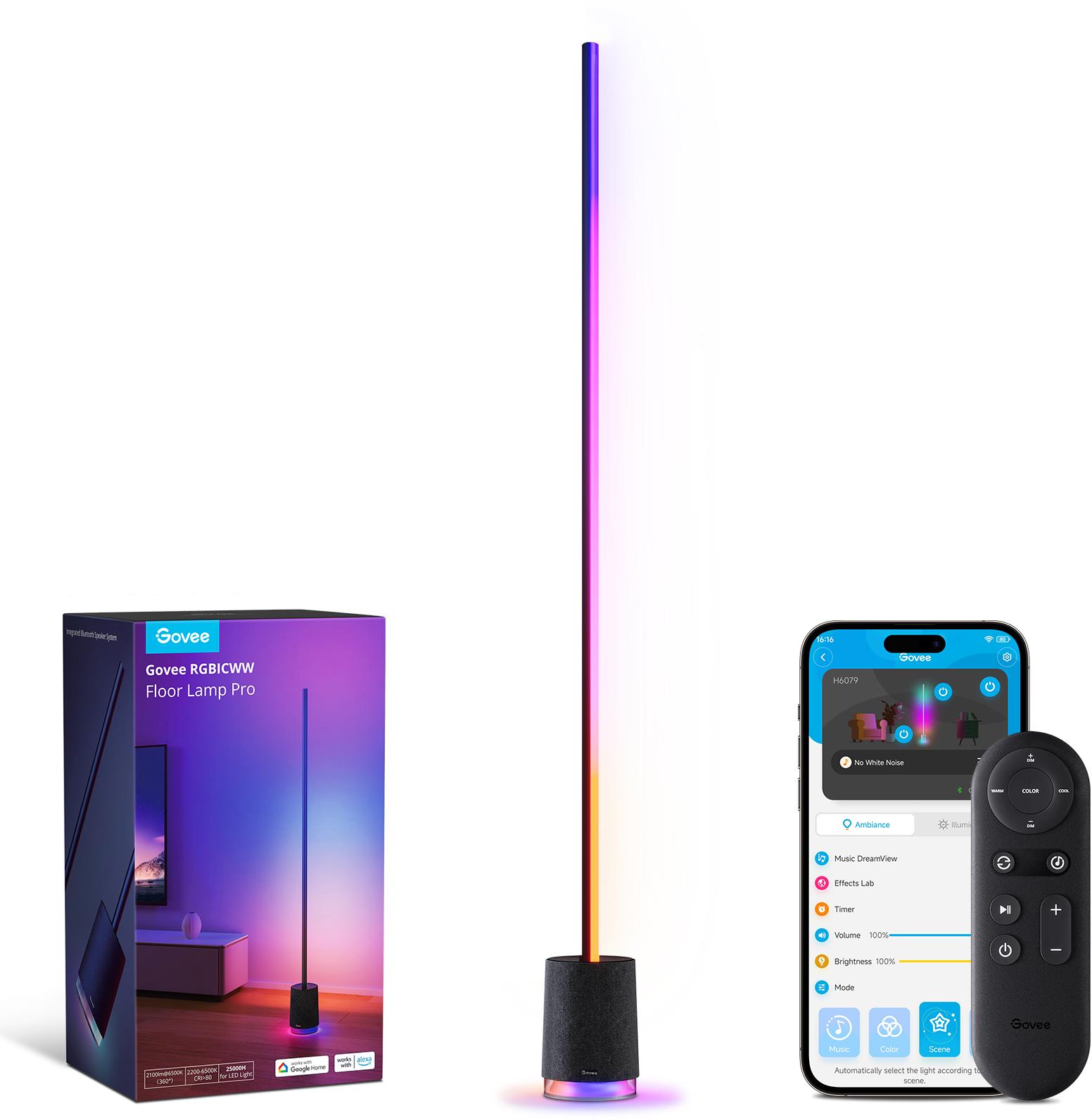 LED svietidlo – inteligentné, stmievateľné, príkon 60 W, svetelný tok 2100 lm, nastaviteľná teplota svetla, (2200 – 6500 K) diaľkové ovládanie, pripojenie cez WiFi 2,4 GHz a Bluetooth, ovládanie pomocou aplikácie v angličtine, kompatibilné s Apple Home, Apple Siri skratky, Google Home a GOVEE Home, materiál: hliník a kov, max. výška 172 cm, šírka 14 cm LED lampa Govee Floor Lamp ProModel Floor Lamp Pro vychádza z modelu Lyre. Ide o minimalistickú a štýlovú lampu, ktorá je navyše vybavená Bluetooth reproduktorom. Govee Floor Lamp Pro disponuje celkom