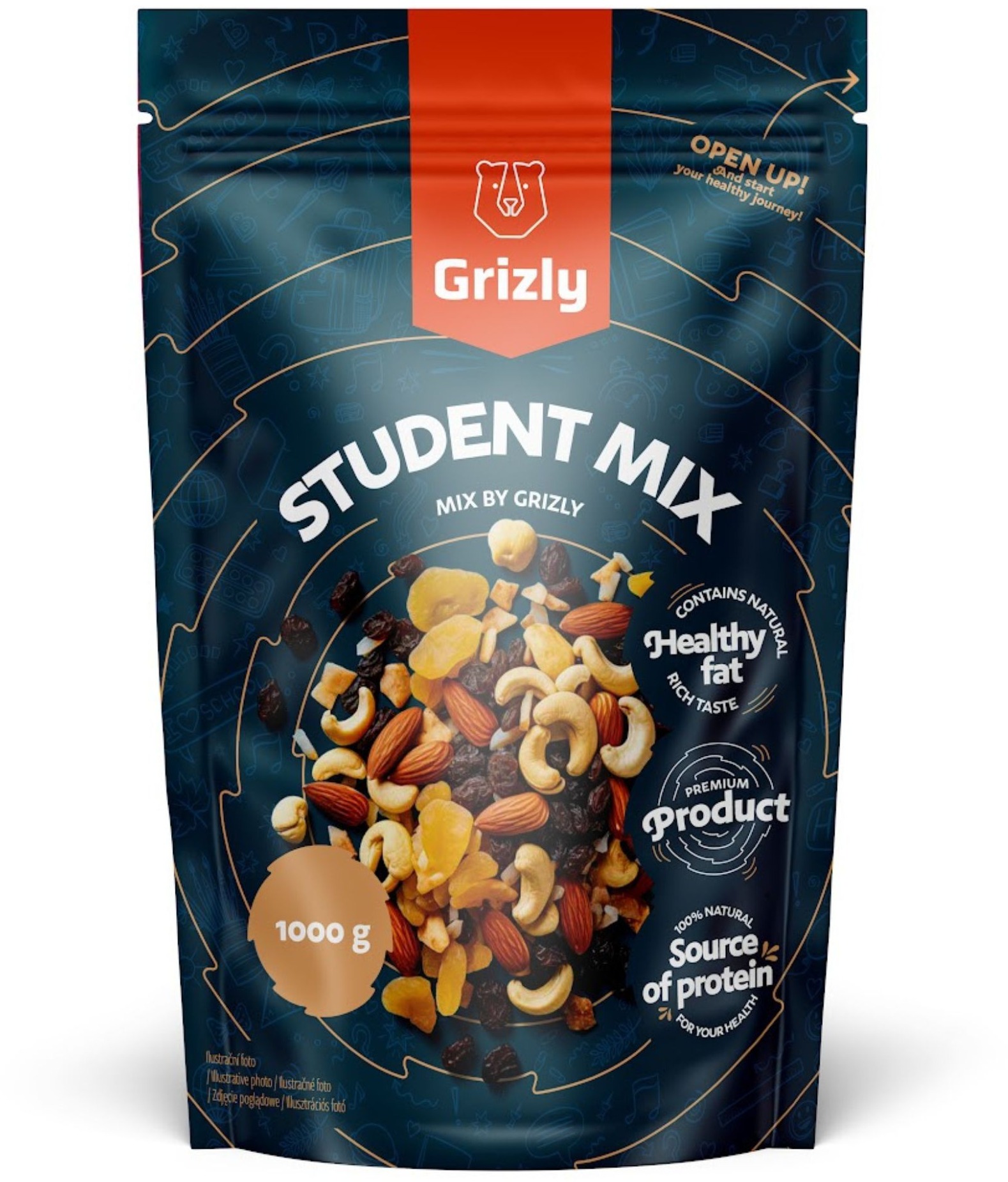 Orechy – mandle, kešu, arašidy a lieskové orechy natural, 1000 g Grizly orechyštudentská zmes, 1 000 g. Vyvážená kombinácia mandlí, arašidov, hrozienok, kešu, ananásu a lieskových orieškov robí zo študentskej zmesi GRIZLY skvelú desiatu plnú energie…