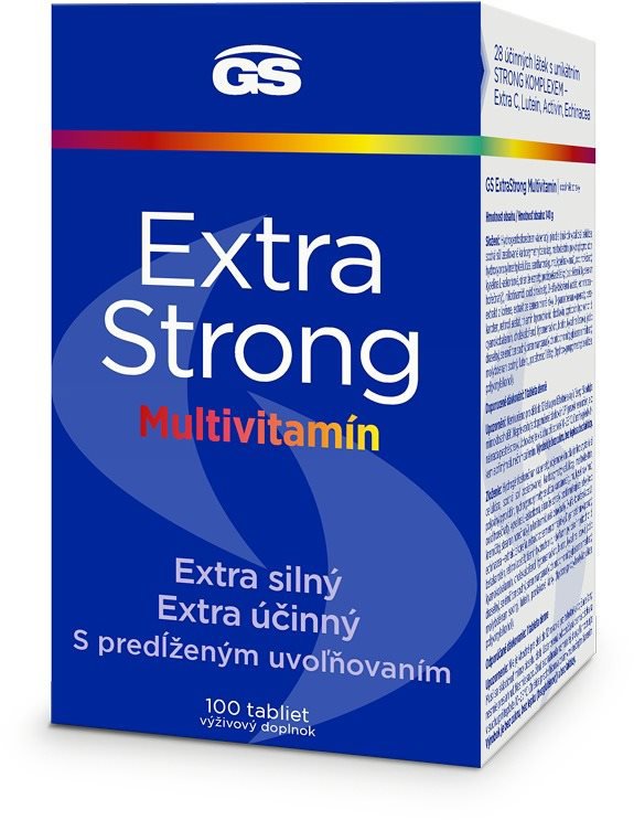 Multivitamín – multivitamín, kombinácia vitamínu C (120 mg), luteínu (0,125 mg), Activinu (10 mg), echinaca (40 mg) a ďalších aktívnych látok v 1 tablete, s unikátnym zložením STRONG KOMPLEX, s predĺženým uvoľňovaním, vhodný na každodenné užívanie, extra silný, 100 tabliet GS Extra Strong Multivitamín, 100 tabliet100 tablietExtra silný multivitamínExtra silný multivitamín s unikátnym zložením STRONG KOMPLEX. Obsahuje extra dávku vitamínu C (150 % RVH), luteín, activín,