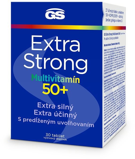 Multivitamín – doplnok stravy, obsahuje kombináciu sibírskeho ženšenu (100 mg), extraktu ginkga (40 mg), vitamínu D3 (10 μg) a ďalších vitamínov a minerálov v 1 tablete, s postupným uvoľňovaním, bez cukru, bez lepku a bez laktózy, 100 tabliet GS Extra Strong Multivitamín 50+100 tablietPre aktívny život po päťdesiatkeGS Extra Strong Multivitamín 50+ pre aktívny život po päťdesiatke. Komplexné a 100 % vyvážené zloženie vitamínov, minerálov a