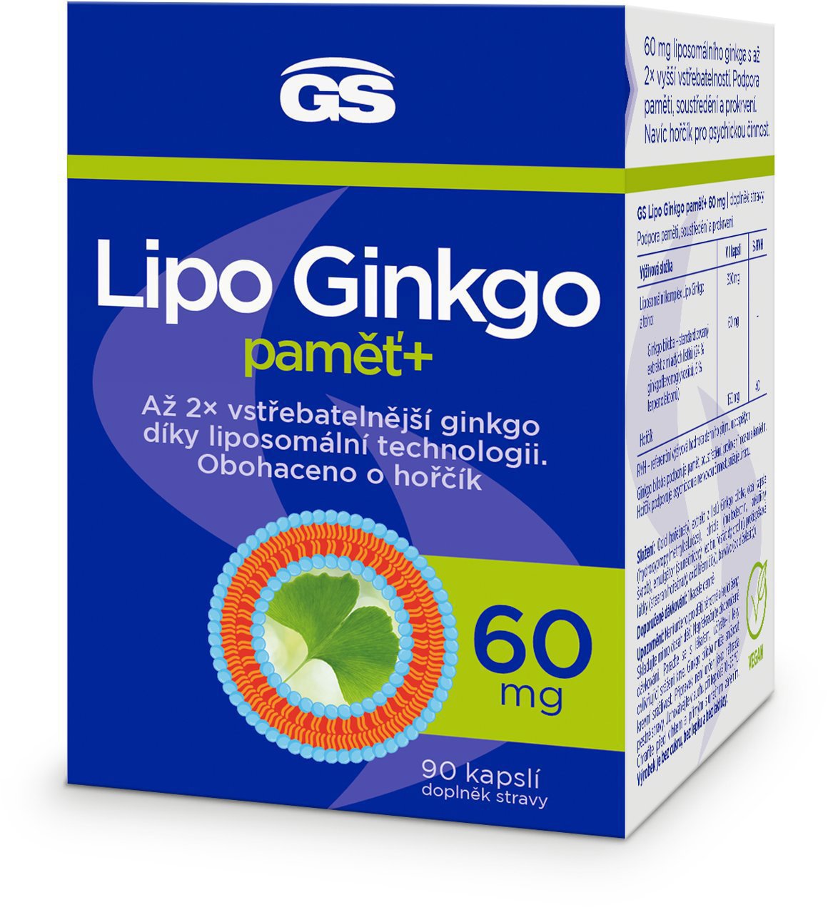 Ginkgo Biloba – ginkgo biloba 60 mg (liposomálna), 2× vyššie vstrebávanie, horčík, 90 kapsúl GS Lipo Ginkgo pamäť + 60 mg90 kapsúlGS Lipo Ginkgo pamäť + je revolučná forma lipozomálneho ginkga s až 2× vyššou vstrebávateľnosťou a maximálnym účinkom. Vďaka unikátnej lipozomálnej technológii je