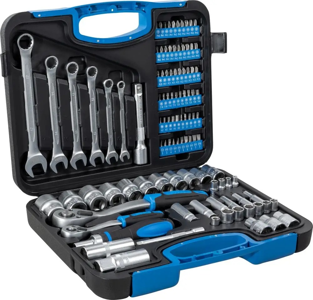Sada náradia – v praktickom kufríku sa skladá zo 104 dielov, obsahuje 2 račne (1/2“ a 1/4“ so 72 zubami) s vhodnými krátkymi a dlhými hlavicami a zodpovedajúcimi predĺženiami, túto sadu dopĺňa veľký sortiment bitov, nástrčných hlavíc, skrutkovač s račňovou funkciou, rovnako ako všetky potrebné adaptéry a 6- očkoplochých kľúčov Gola súprava GÜDE GWZK obsahuje celkom 104 kusov náradia, ktoré sa hodí na domáce aj profesionálne použitie. Nástroje sú vyrobené z odolnej chróm-vanádiovej ocele a uložené v praktickom kufríku, kde m