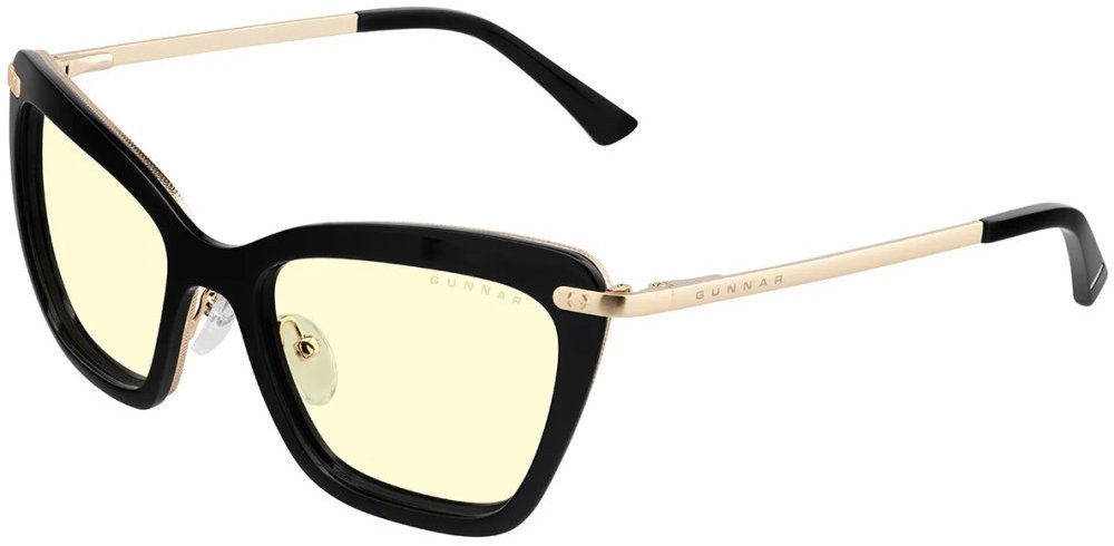 Okuliare na počítač – dámske/dievčenské, na počítač, ochrana proti modrému svetlu 65 %, obdĺžnikové, materiál rámu: plastový, oranžová farba skiel, čierna a zlatá farba rámu, UV ochrana UV400, v balení pevné puzdro, handrička na čistenie a plátené vrecúško, šírka okuliarov 13,6 cm Dámske okuliare na počítač GUNNAR ponúkajú 65 % ochranu proti modrému svetlu a tým chránia zrak pri dlhodobom používaní obrazoviek. Dioptrické okuliare na PC na blízko s dioptriami 0,2 zaistia jasný a