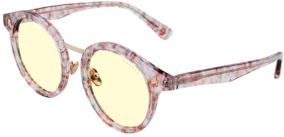 Okuliare na počítač – dámske/dievčenské, na počítač, ochrana proti modrému svetlu 65 %, okrúhle, materiál rámu: kombinácia plast/kov, oranžová farba skiel, biela a ružová farba rámu, UV ochrana UV400, v balení pevné puzdro, handrička na čistenie a plátené vrecúško, šírka okuliarov 13,7 cm Dámske okuliare na počítač GUNNAR poskytujú 65 % ochranu proti modrému svetlu a tým znižujú námahu očí a predchádzajú poškodeniu zraku pri dlhodobom používaní displejov. Dioptrické okuliare na PC na b