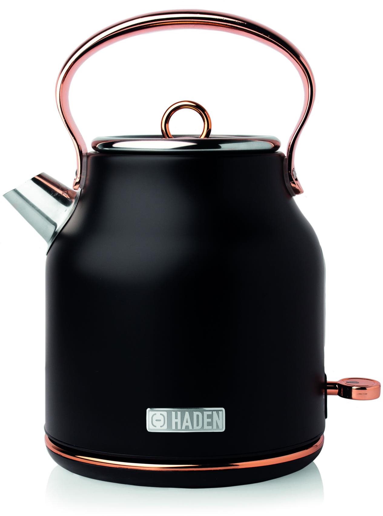 Rýchlovarná kanvica – antikorová, objem 1,7 l, čierna farba, príkon 3000 W, filter, otočná základňa, podsvietený vypínač, skrytá špirála a úložný priestor na kábel, automatické vypnutie, ochrana proti prehriatiu, tepelná poistka, ukazovateľ vodnej hladiny, vyberateľný filter Dizajnová rýchlovarná kanvica Heritage Black and Copper anglickej značky Haden vybavená ergonomickou rukoväťou na ľahké uchopenie, LED kontrolkou varu vody v kanvici a praktickou 360° základňou. Maxim