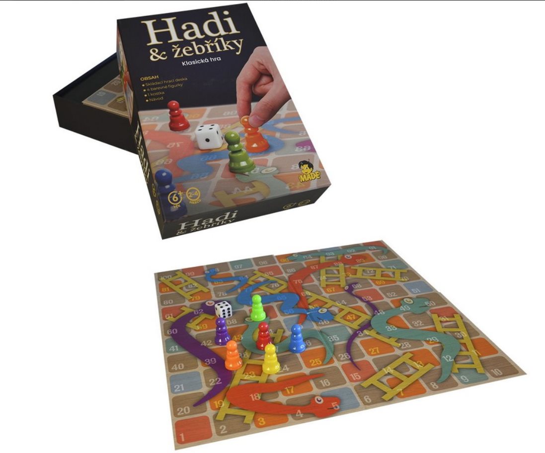 Spoločenská hra – rodinná, pre 2 až 4 hráčov, ľahká obťažnosť, dĺžka hry 30 min, vhodné od 6 rokov Hadie slučky a výstupy po rebríkoch sú klasika v štýlovom vyhotoveníObľúbená dosková hra Hady a rebríky sa predstavuje v luxusnej edícii od značky MADE. Hráči postupujú po hernom pláne, stúpajú po reb