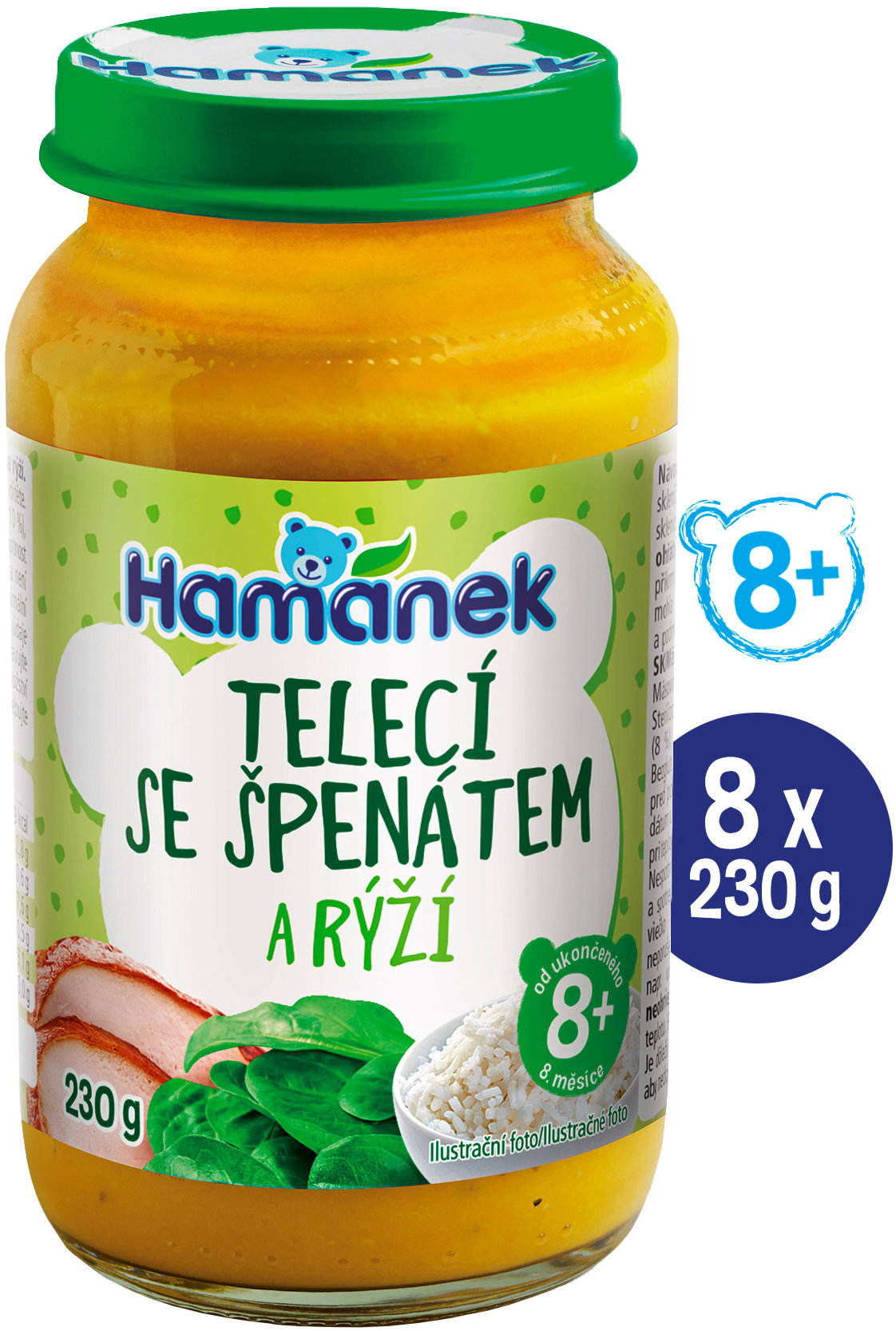 Príkrm – mäsovo-zeleninový, pre deti od 7 mesiace, bez lepku, bez prídavku soli, 8 ks v balení Hamánek Teľacie so špenátom a ryžouPríkrm Hamánek Teľacie so špenátom a ryžou je prispôsobený chuti najmenších gurmánov od ukončeného 8. mesiaca. Vyniká jemnou chuťou a neobsahuje pridanú soľ ani lepo