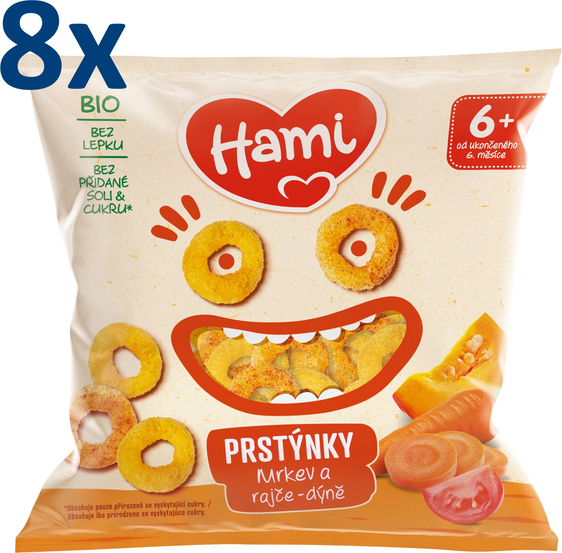 Chrumky pre deti vhodné od 6 mesiace, bez lepku a prídavku soli HAMI PrstienkyHami Prstienky sú zábavnou desiatou pre malé, ale aj väčšie ratolesti. V jednom balení nájdete dve lahodné príchute: mrkva a paradajka-tekvica. Objavte zdravé a lahodné chrumky, ktoré sú