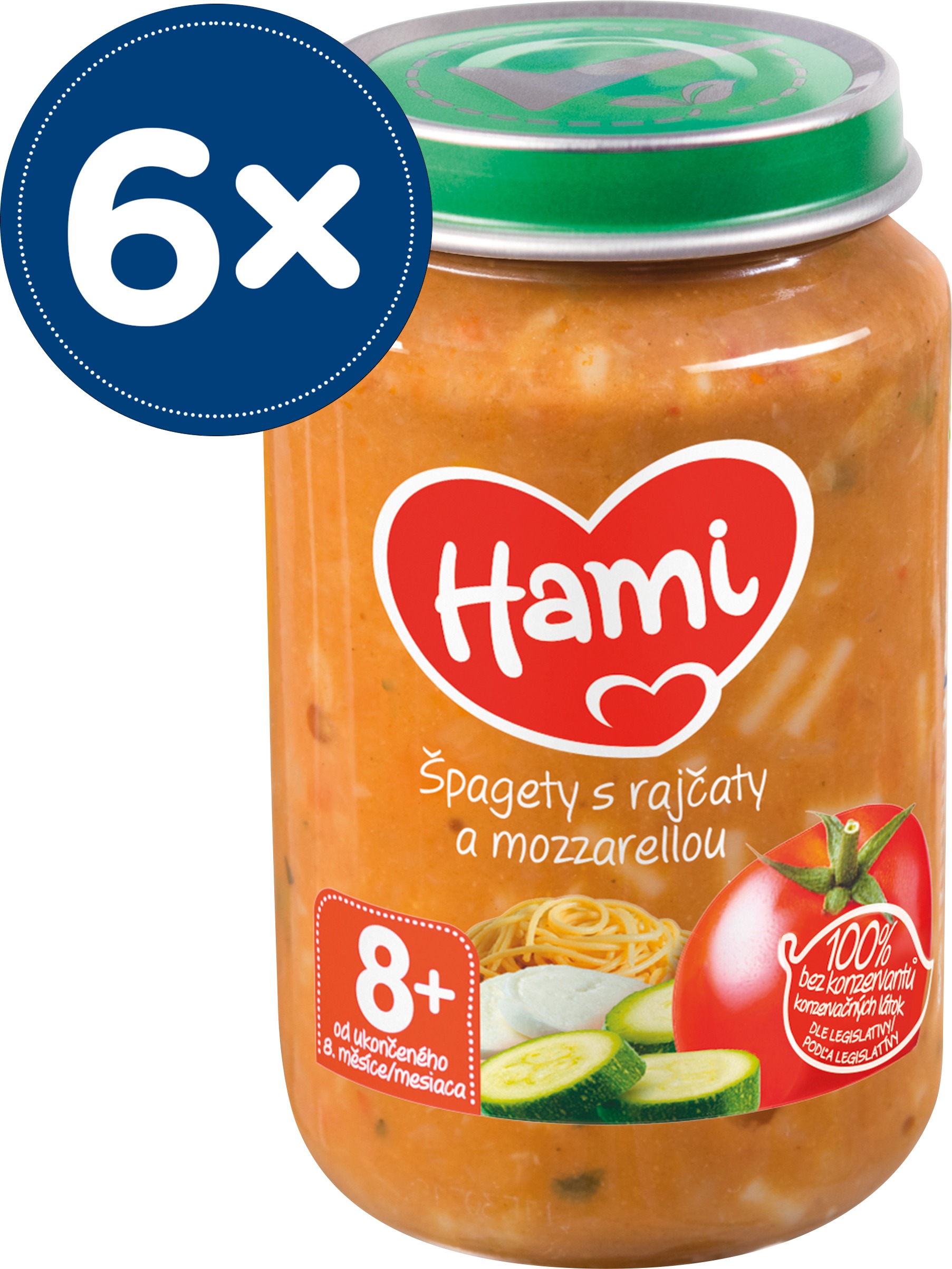 Príkrm – zeleninový a cestoviny/ryža, pre deti od 8 mesiace, bez konzervantov a umelých farbív, bez lepku, 6 ks v balení Príkrm HAMI špagety s paradajkami a mozzarellouHami Príkrm špagety s paradajkami a mozzarellouobohatí jedálniček vášho dieťaťa. Je vyrobený z kvalitnej zeleniny varenej v pare, aby nestratila svoju ch