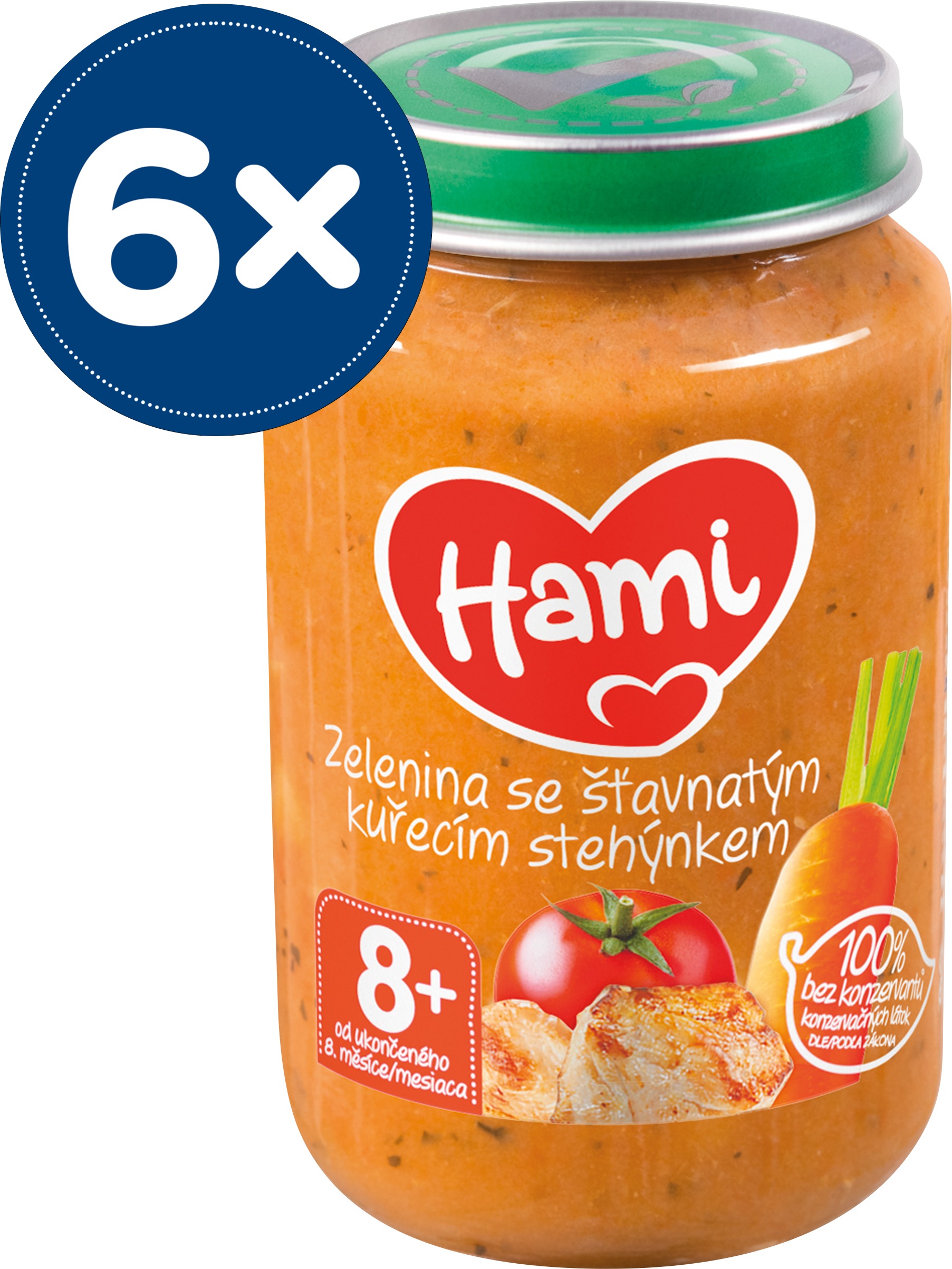 Príkrm – mäsovo-zeleninový, pre deti od 8 mesiace, bez konzervantov a umelých farbív, bez lepku, bez prídavku soli, 6 ks v balení Príkrm Hami zelenina so šťavnatým kuracím stehienkomHami príkrm zelenina so šťavnatým kuracím stehienkom je ideálny pri zavádzaní mäsa a zeleniny do jedálnička vášho dieťaťa. Túto chutnú a zdravú zele
