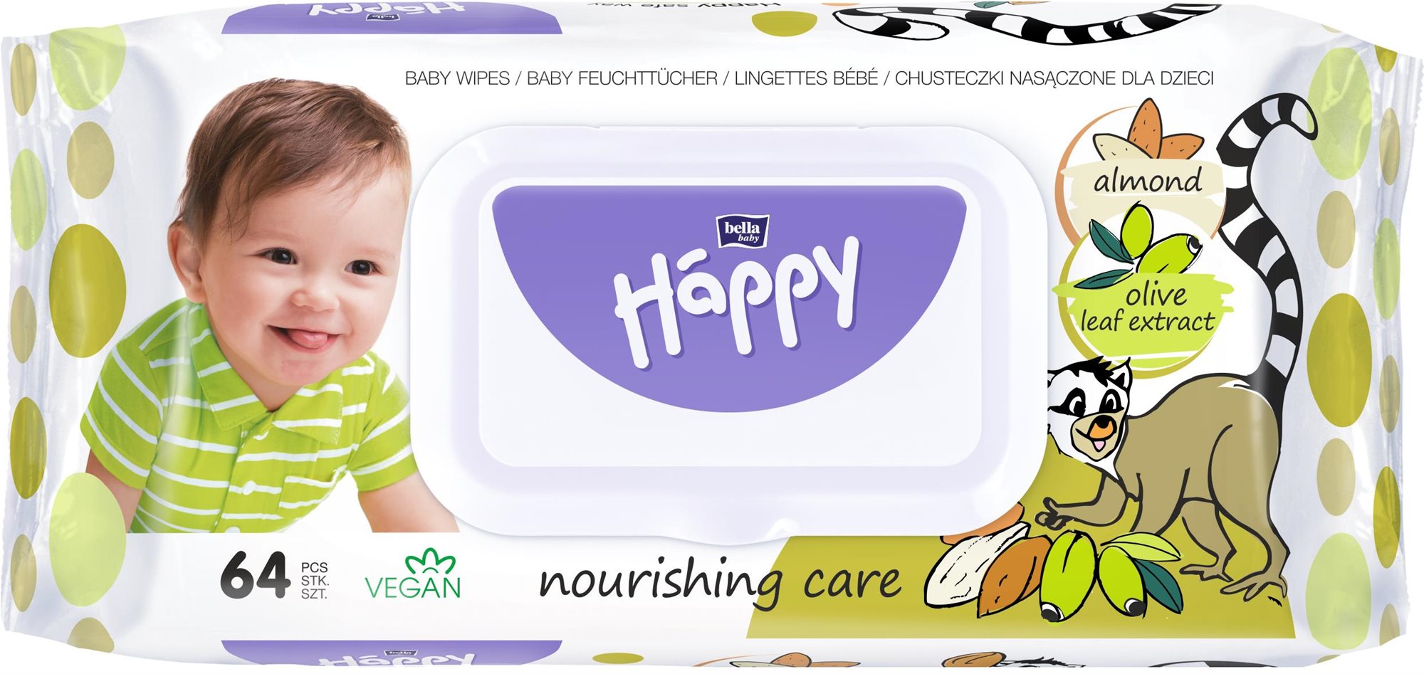 Vlhčené obrúsky – detské, na telo, čistiaci účinok, bez alkoholu, neutrálne pH a vegánske, obsahujú rastlinné výťažky, s parfumovaním, vhodná je normálna, citlivú (sensitive) a detskú pleť, 64 ks v balení Čistiace obrúsky Bella Baby Happy Almond and Olive Leaf extrakt jednoducho, rýchlo a spoľahlivo sa starajú o detskú pokožku. Recyklovateľný obal prispieva k ochrane životného prostredia a navyše je je