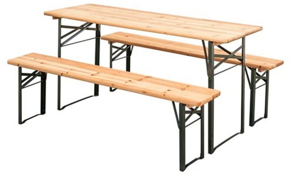 Záhradný nábytok – zostava, 2 lavice, nosnosť 250 kg, stôl obdĺžnik, rozmer 180 cm × 50 cm × 77 cm, materiál dosky stola drevo, materiál sedadla/opierky chrbta lavice drevo Záhradný pivný set je ideálnym riešením na vonkajšie posedenie pri grilovaní, oslavách alebo na záhradkách reštaurácií. Obsahuje stabilný stôl a dve lavice, ktoré sú vyrobené z prírodného dreva a pevn