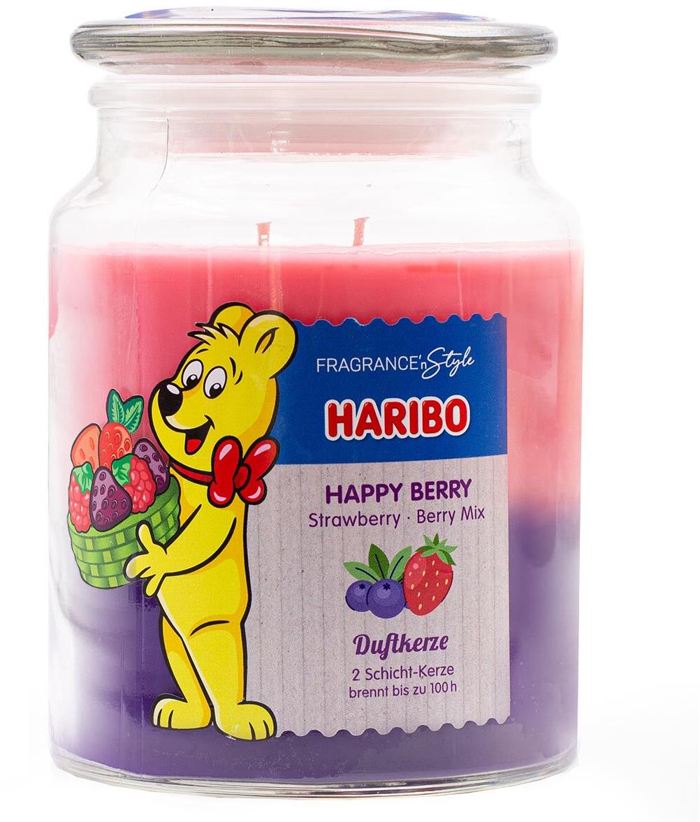Sviečka – vonná, každodenná, sladká vôňa 2 knôty, sklenená nádoba, okrúhly tvar, materiál parafín, viacfarebná, doba horenia 100 h Sviečka HARIBO Happy Berry 2 v 1 s ikonickým dizajnom obľúbeného žltého medveďa na etikete osloví…