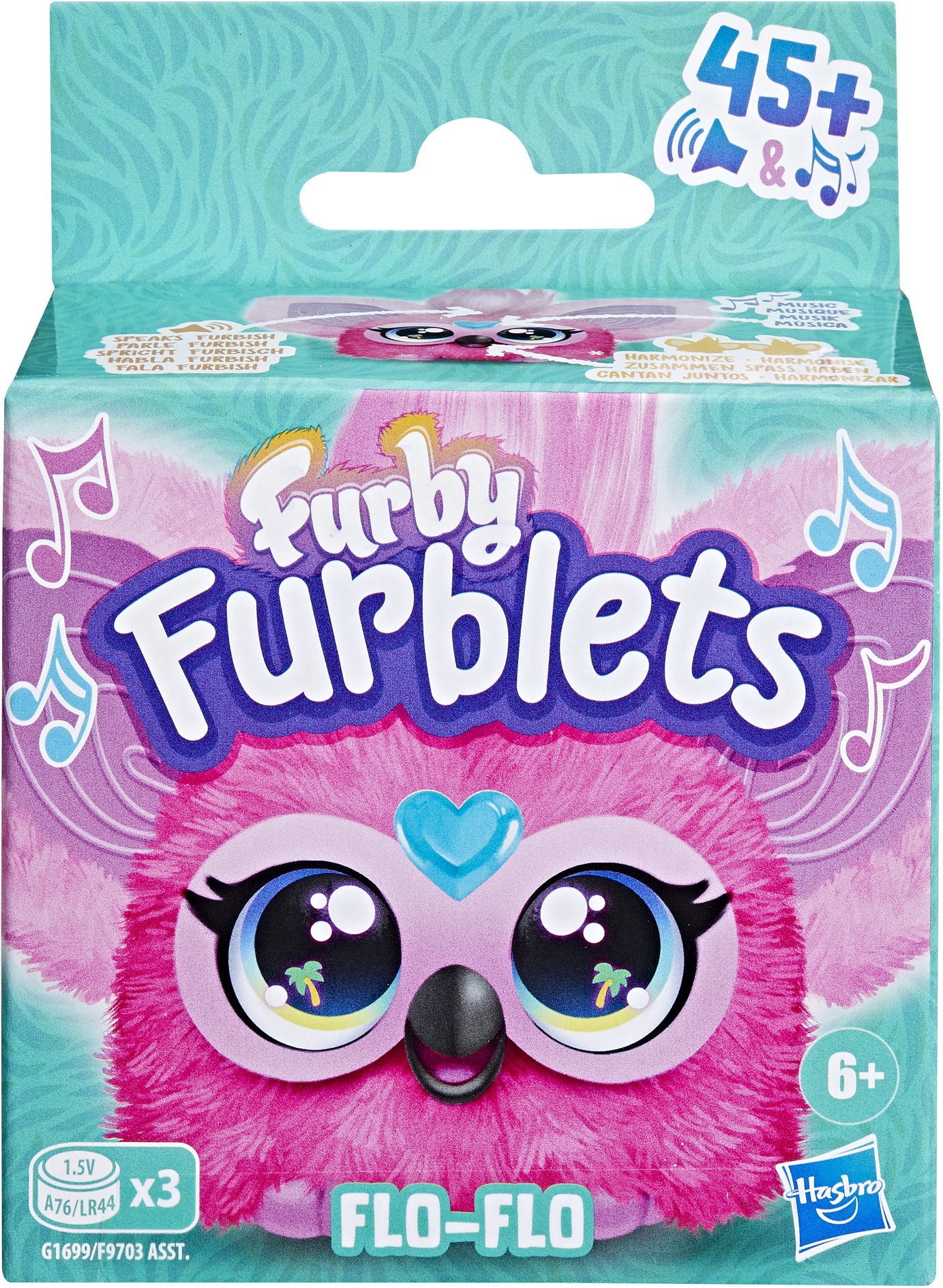 Plyšová hračka – hovoriaca a zvukové efekty, s výškou 5 cm, vhodná pre deti od 6 rokov, na 3 LR44 batérie (sú súčasťou balenia) Bláznivý dizajnový kamarát Hasbro Furby Furblet Flo-Flo nadchne všetky deti okrúhlym telíčkom, veľkými sklápacími ušami, zvláštnym jazykom a zábavnou hudbou a zvukmi. Po stlačení zobáčika sa ozvú zvuk