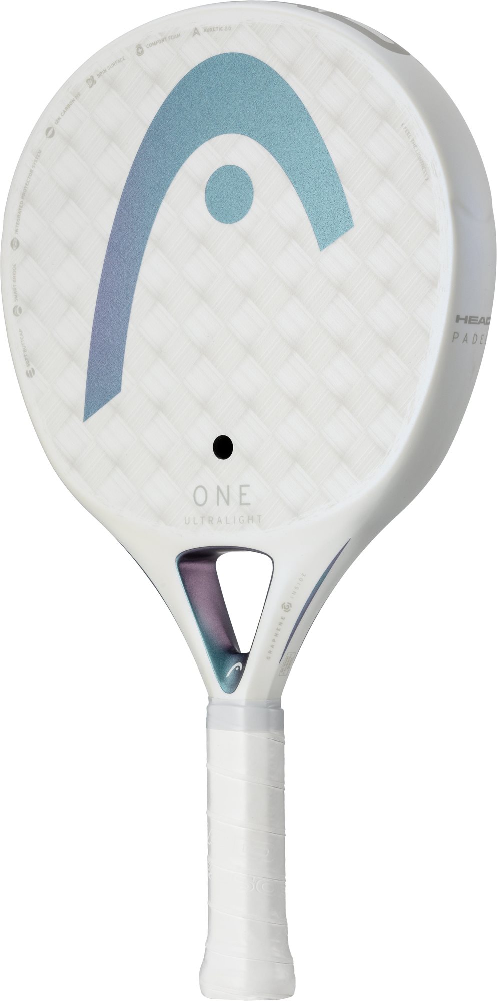 Padelová raketa – okrúhly tvar, rekreačná, materiál rámu karbón, veľkosť hlavy 468 cm2, hmotnosť 300 g, biela farba Padelová raketa Head One Ultralight je ideálna pre začínajúcich hráčov, ženy aj juniorov, pretože vyniká nízkou hmotnosťou. Dokáže sa však prispôsobiť úrovni hry. Zábavná a ľahko hrateľná raketa je na