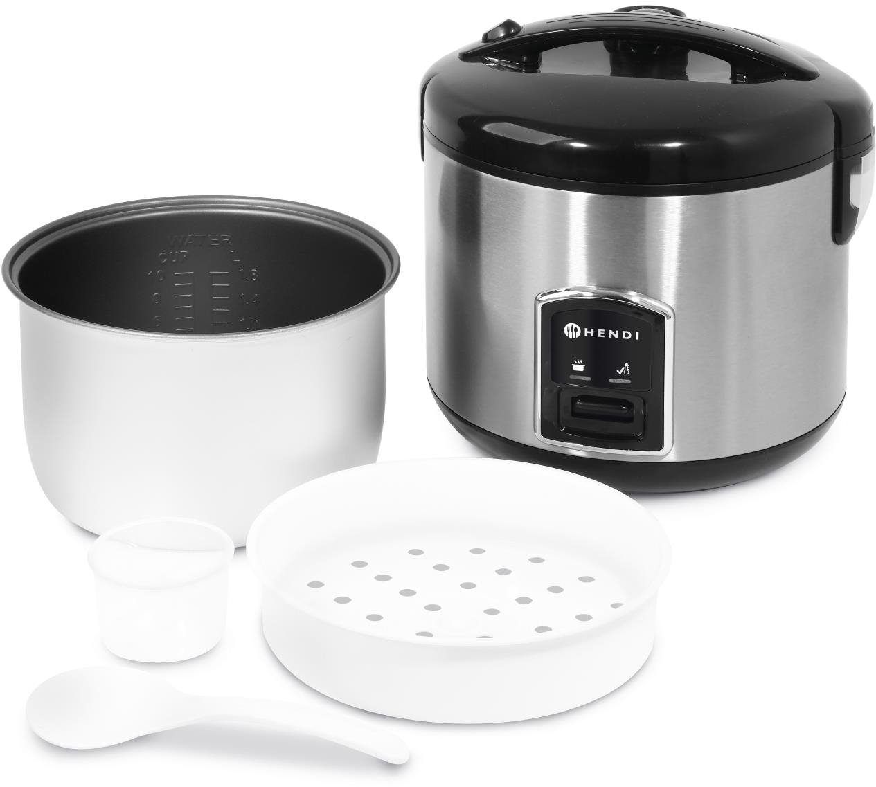 Ryžovar – funkcia varenia v pare, objem 1,8 l, vo výbave vyberateľná nádoba, udržanie teploty, príkon 700 W, lyžica, odmerka a naparovací vejár súčasťou balenia, rozmery 28,5 × 28,3 × 29,3 cm (V׊×D), hmotnosť 2,74 kg, strieborná farba Ryžovar HENDI 1,8 l 240410 je praktický elektrický hrniec, ktorý pomôže s varením ryže. Je ideálny na prípravu ryže na všetky spôsoby, vrátane tej špeciálnej na sushi. Hrniec funguje na princípe varen