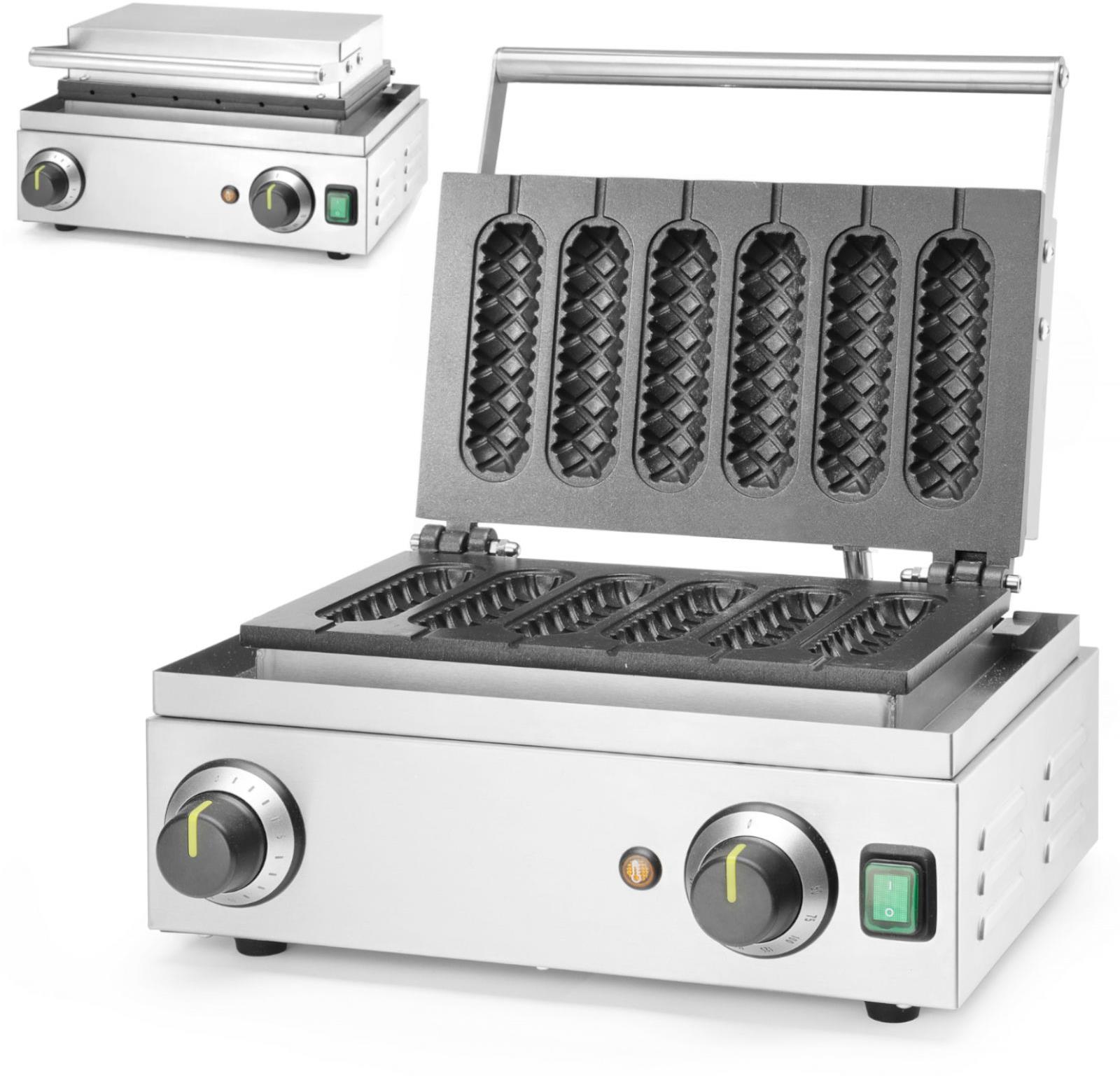 Vafľovač na vafle, nepriľnavý povrch, počet vaflí: 6, tvar vaflí: obdĺžnik Profesionálny vaflovač Hendi 212189 Corn-dog obohatí každý podnik alebo stravovacie zariadenie o úžasne chutné, zlaté a chrumkavé vafle na drievku alebo moderné kukuričné párky. Prístroj tvorí hliníko