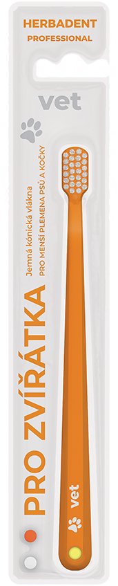 Zubná kefka pre psa a mačky – pre menšie plemená psov a mačiek, vlákna na konci zúžené tak, aby prenikli do horšie dostupných miest, rukoväť vyrobená z eko plastu zo zvyškov rastlín Zubná kefka Herbadent Vet Professional je určená na starostlivú dentálnu hygienu menších plemien psov a mačiek. Na konci zúžené nylonové vlákna umožňujú efektívne odstránenie zubného povlaku aj z hor