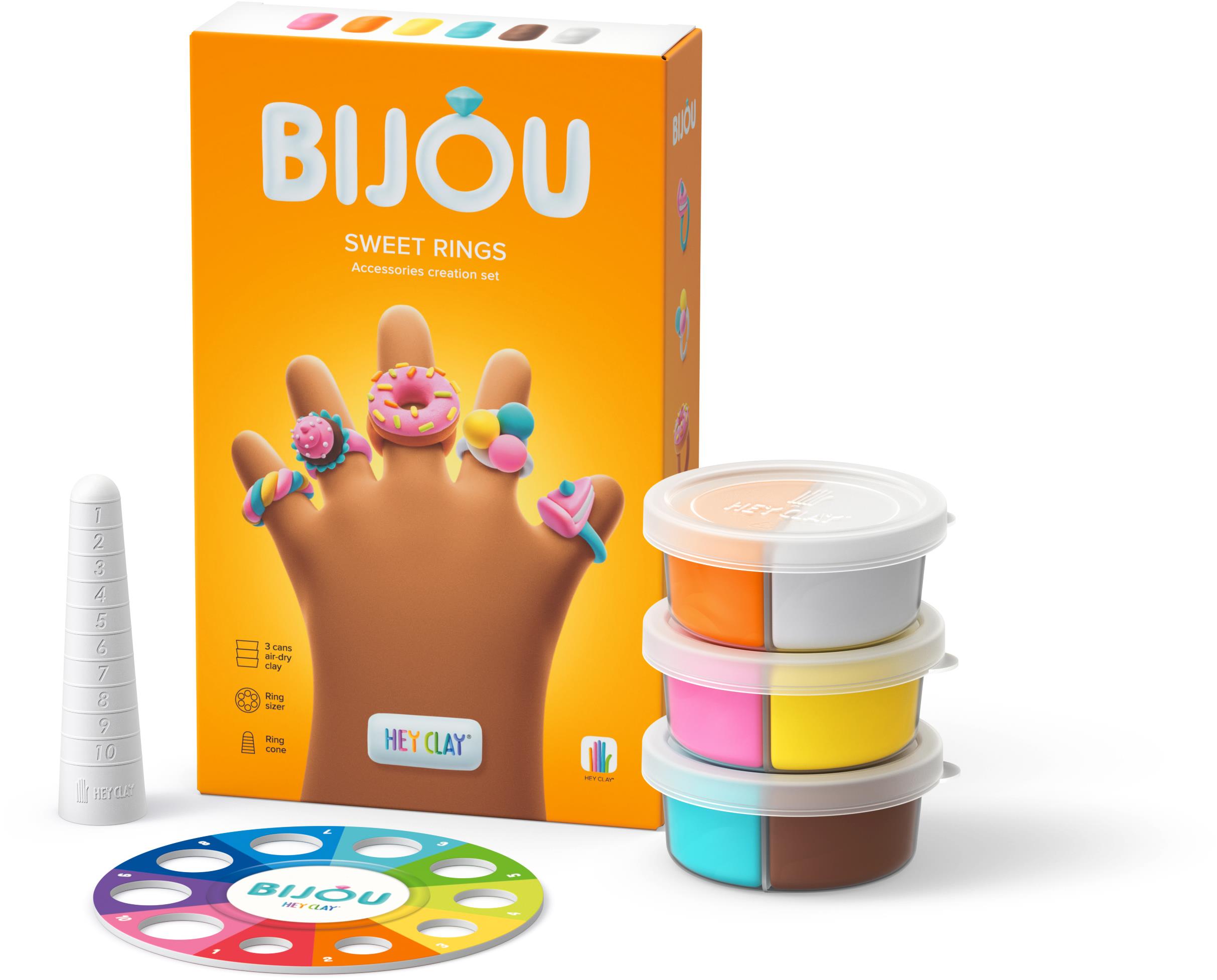 Modelína – téma šperky, vhodná od 5 rokov Zháňate pre vaše dieťa kreatívnu zábavu, ktorá rozvíja jemnú motoriku a dizajnérsky cit? Hey Clay Bijou roztomilé prstienky prinášajú svet fantázie a módy priamo do detského sveta. S touto súpravou si