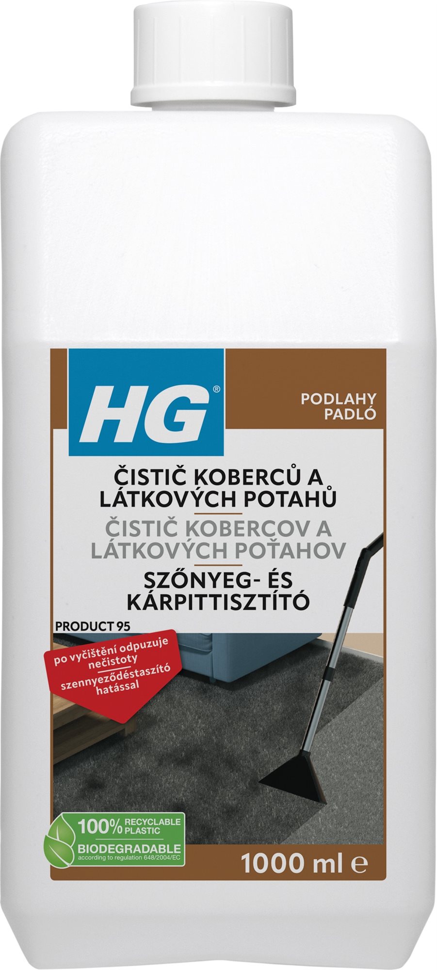 Čistič kobercov a čalúnenia – koncentrovaný, recyklovateľný obal, bez chlóru, ochrana povrchov a čistenie, forma čističa: tekutina, bez aplikátora, objem 1000 ml Čistič kobercov a látkových poťahov HG odstráni nečistoty a zocelí drsný povrch vlákien vzácneho (podlahového) koberca vrstvou odolnou voči špine. Čistí dôkladne a rýchlo do hĺbky bez toho, aby poškod