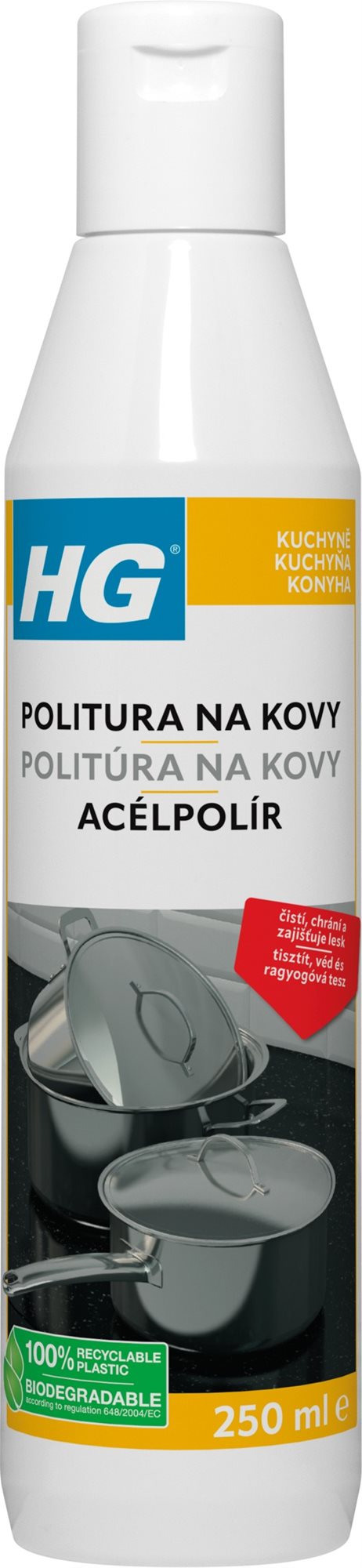 Čistič na nerez – čistí, leští, chráni, bráni rýchlemu opätovnému zašpineniu Prípravok HG politúra na kovy je ošetrujúci prípravok pre antikorové kuchynské plochy, hrnce a kuchynské potreby. Ale aj pre hliníkové nádoby, pracovné plochy z tvrdého plastu, chrómové kohútiky, kanv