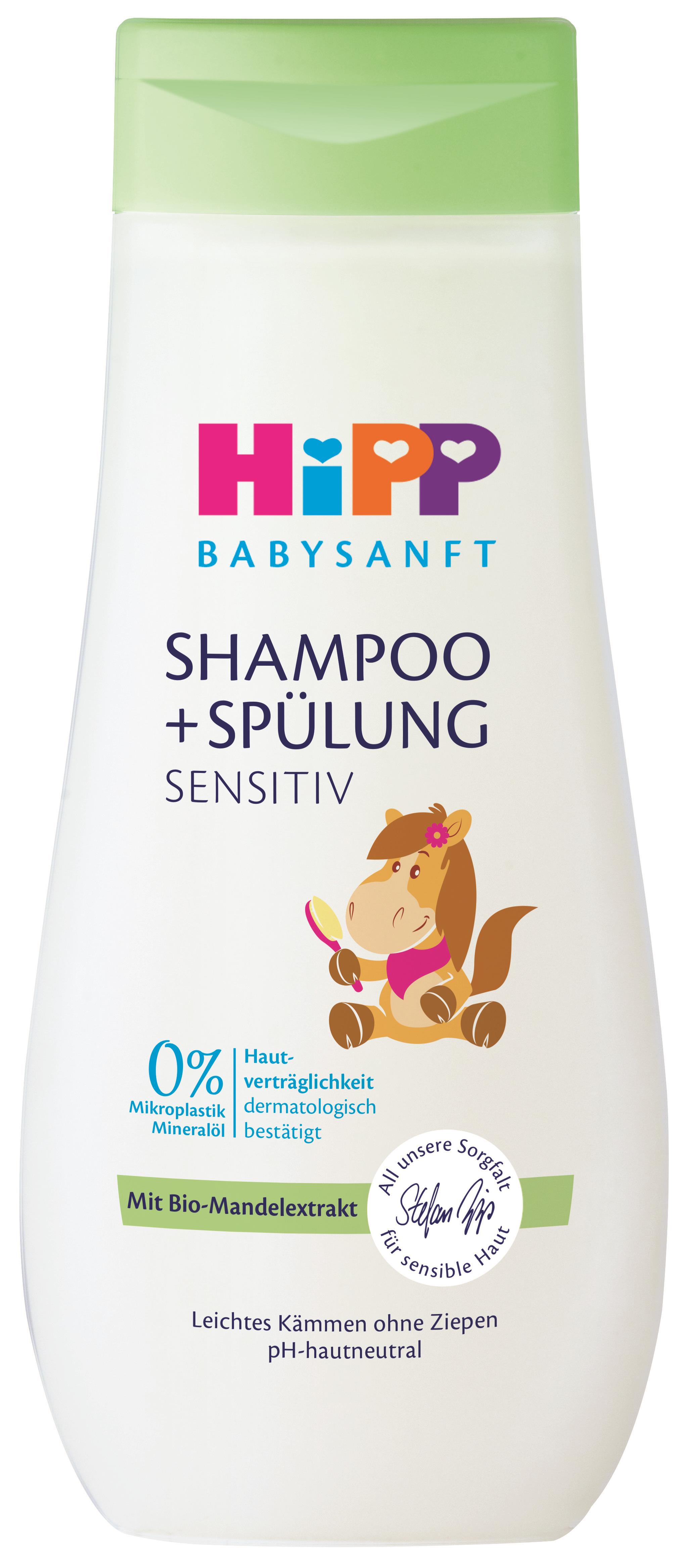 Detský šampón – vhodný od narodenia, tekutý, na všetky typy vlasov, zloženie bez parfumovania, bez silikónu a s neutrálnym pH, objem 200 ml, vegan HiPP Babysanft šampón s kondicionérom umýva detské vlásky obzvlášť šetrne. Uľahčuje rozčesávanie dlhých vlasov, neštípe v očiach a chráni vlasy aj pokožku hlavy pred vysušením. Obsahuje cenné prírodn