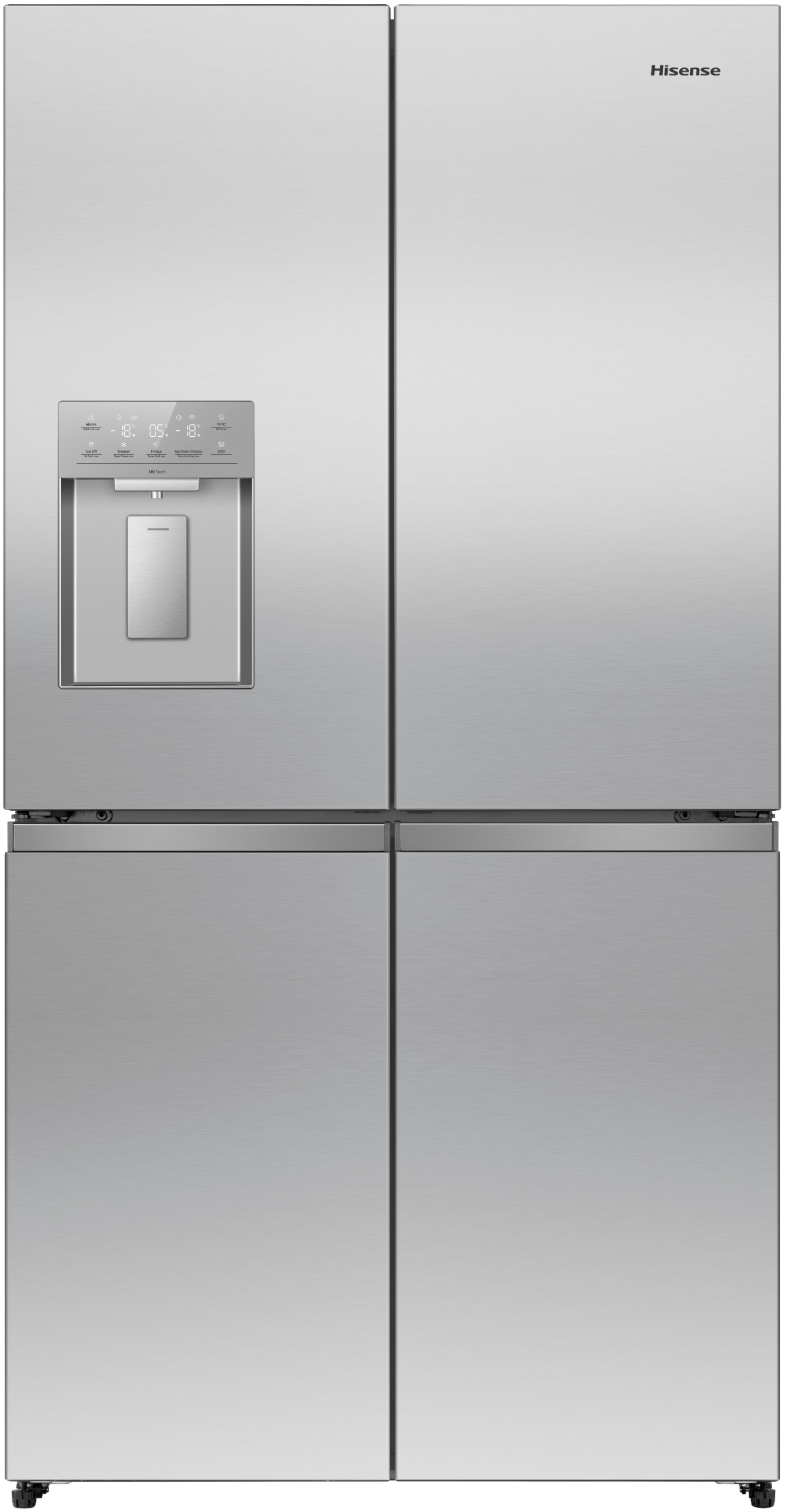Americká chladnička – štvordverová, energetická trieda D, objem chladničky 390 l, objem mrazničky 250 l, voliteľné umiestnenie pántov, 4 police, 6 priehradiek v mrazničke, 2 chladiace okruhy, displej, LED osvetlenie, indikácia otvorených dverí chladničky, smart funkcie a polohovateľné police, rozmery 179 × 91 × 72,5 cm (V׊×H) Americká chladnička Hisense RQ5P640SYSDAmerická chladnička Hisense RQ5P640SYSD prináša veľkorysý priestor, flexibilné nastavenie teploty, smart funkcie a pokročilé chladenie, ktoré zaistí dlhodobú čer
