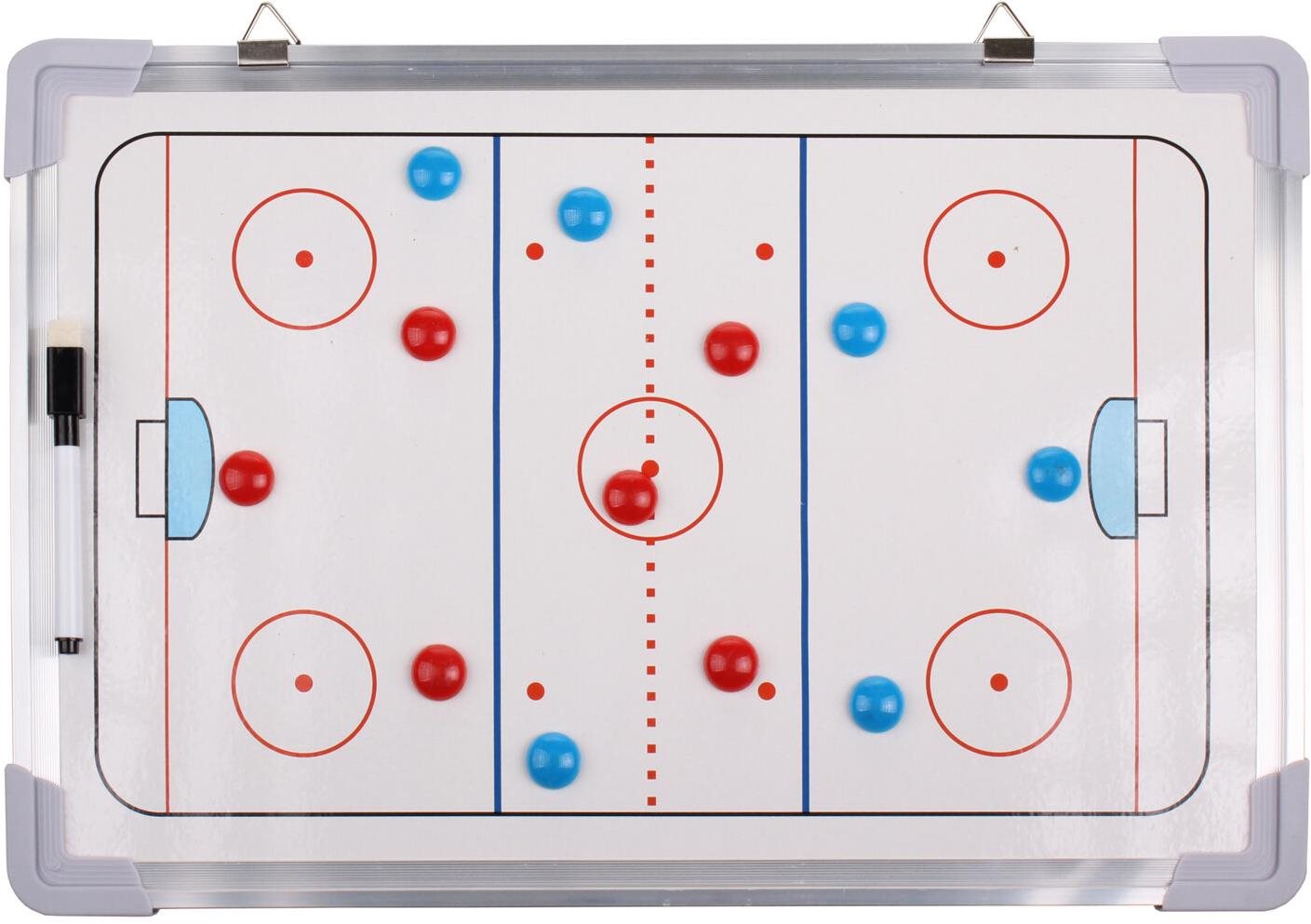 Taktické tabule – magnetická, obojstranná, materiál rámu hliník, sada 12 magnetov, popisovač, hubka, rozmery 455 × 305 cm, hmotnosť 650 g Trénerská tabuľa na hokej predstavuje nevyhnutný nástroj pre každého hokejového trénera, a to bez ohľadu na vekovú kategóriu hráčov alebo úroveň súťaže. Model Merco HOKEJ 43 ponúka prehľadné spracovan