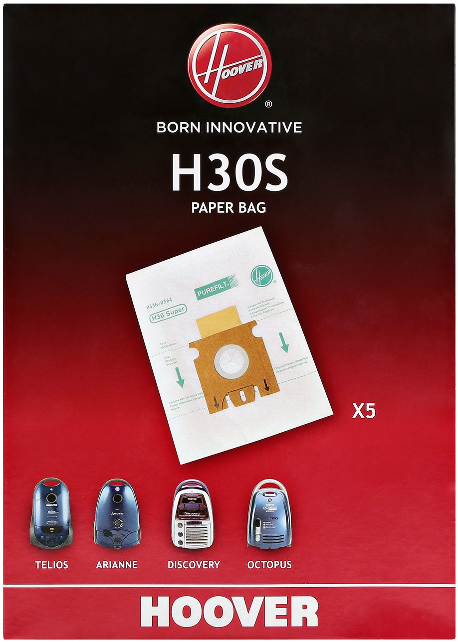 Vrecká do vysávača HOOVER – papierové, jednorazové, súčasťou balenia je tiež filter, 5 vreciek v balení Vrecká do vysávača HOOVER H30S – vysokofiltračné, papierové, 3-vrstvové, v balení sa nachádza 5 kusov, filtre nie sú súčasťou balenia.